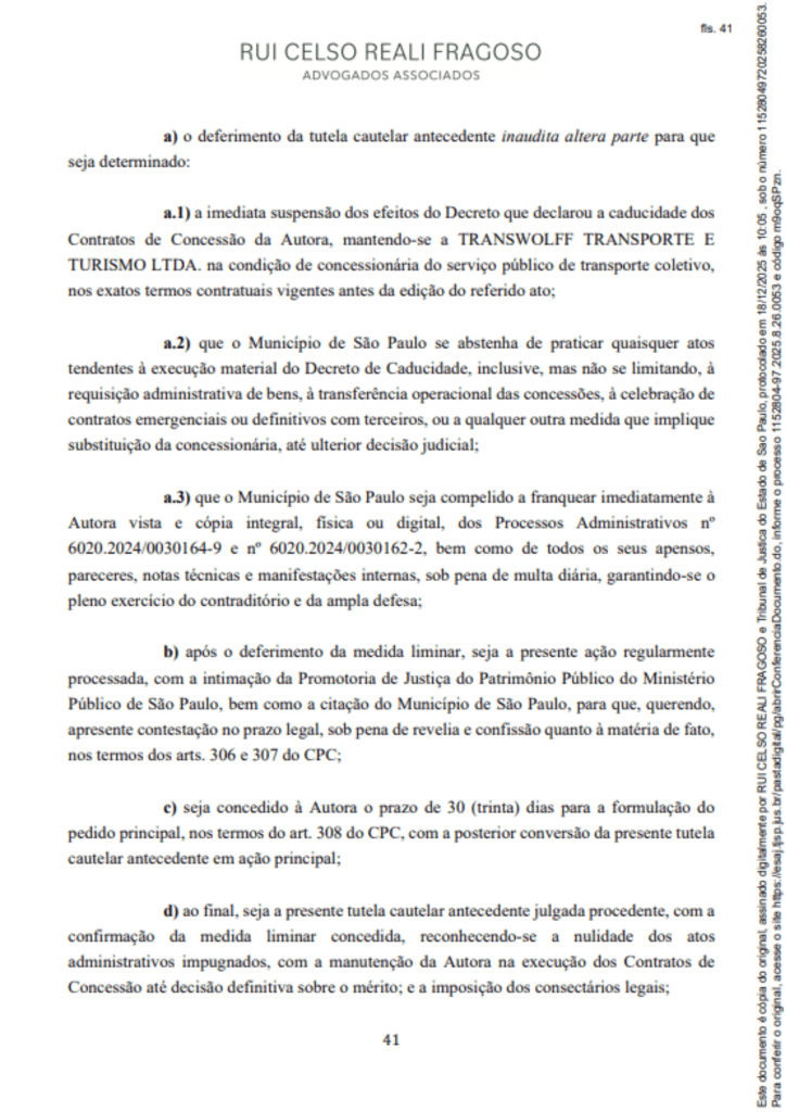 a.1) a imediata suspensão dos efeitos do Decreto que declarou a caducidade dos Contratos de Concessão da Autora, mantendo-se a TRANSWOLFF TRANSPORTE E TURISMO LTDA. na condição de concessionária do serviço público de transporte coletivo, nos exatos termos contratuais vigentes antes da edição do referido ato;