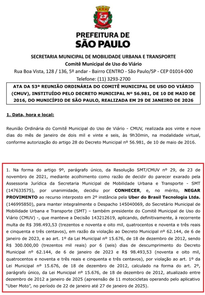 A decisão consta na ata da 53ª Reunião Ordinária do Comitê Municipal de Uso do Viário (CMUV), realizada em 29 de janeiro de 2026, e foi publicada no Diário Oficial da Cidade de São Paulo nesta terça-feira, 03 de fevereiro de 2026. Por unanimidade, o colegiado decidiu conhecer e negar provimento ao recurso interposto pela empresa em segunda instância administrativa, mantendo integralmente o despacho do secretário municipal de Mobilidade Urbana e Transporte, que também preside o comitê.