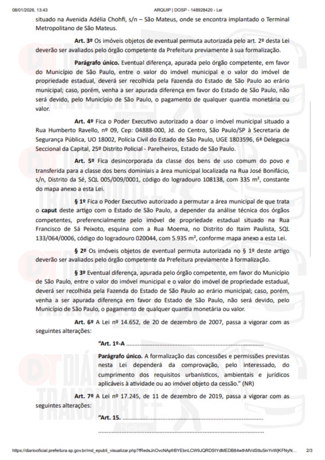 Já no artigo quinto da mesma lei, o prefeito Ricardo Nunes propõe para a gestão Tarcísio de Freitas transferir para o Estado a titularidade de imóvel na rua José Bonifácio, no centro (praça em frente à SSP – Secretaria de Segurança Pública), mediante permuta de um terreno de propriedade estadual localizado dentro de uma quadra no Itaim Paulista, na zona Leste da capital onde originalmente seria instalada uma ETEC (Escola Técnica Estadual), mas que agora é área de interesse da prefeitura para instalação do Terminal Itaim Paulista.