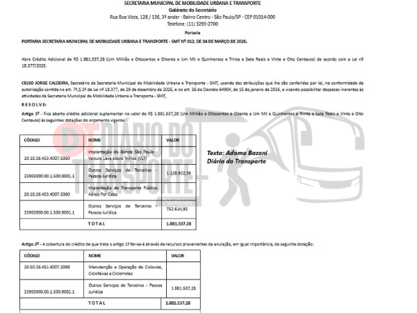A Secretaria Municipal de Mobilidade Urbana e Transporte – SMT, da capital paulista, publicou nesta quinta-feira, 05 de março de 2026, um remanejamento de recursos que iriam para manutenção e operação de ciclovias e, agora, vão para estudos sobre dois projetos de transportes na cidade.