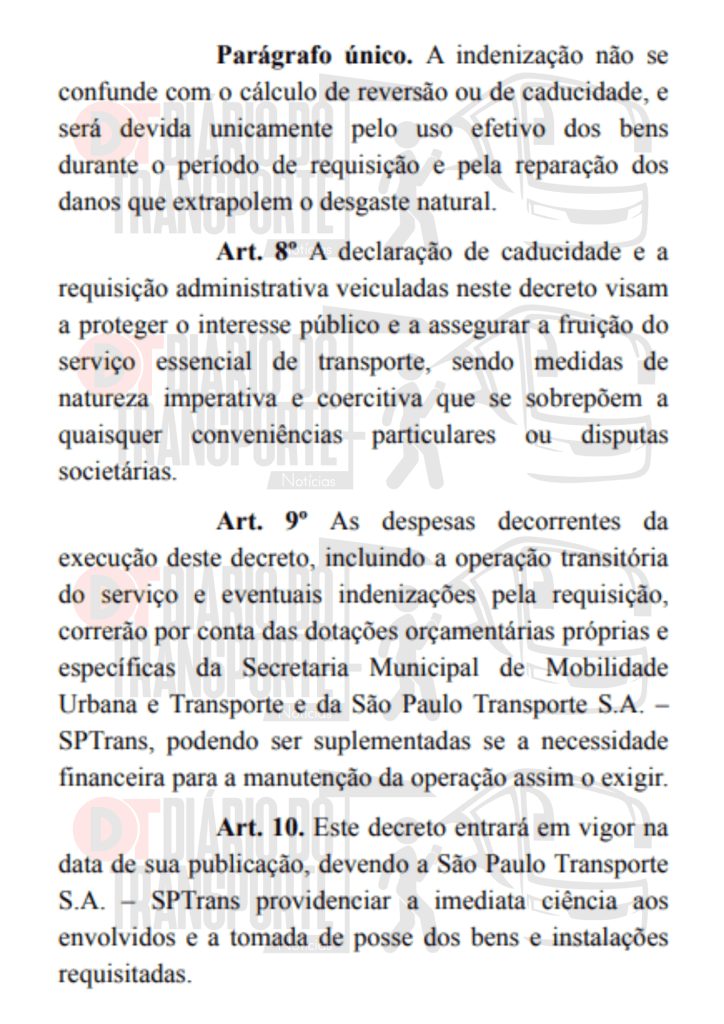 – A gerenciadora de transportes da prefeitura SPTrans (São Paulo Transporte) foi autorizada pelo decreto a ocupar e utilizar, de forma precária e emergencial, todos os locais físicos, instalações, equipamentos, material rodante, veículos, peças e demais bens afetos ao serviço, bem como assumir a responsabilidade pelos funcionários;