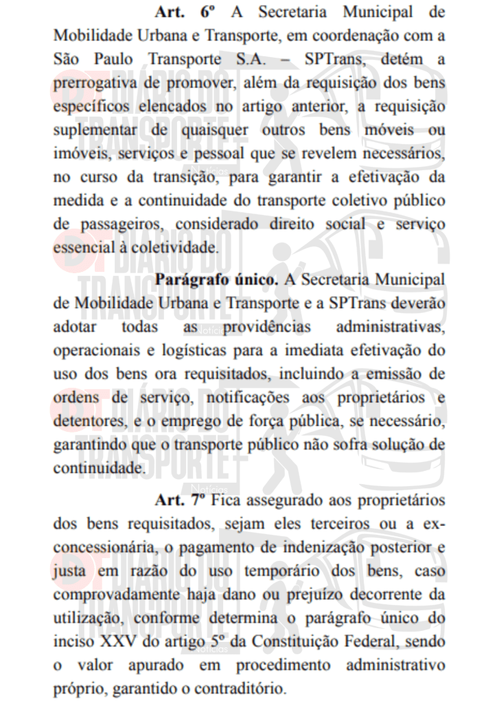 – A prefeitura garante aos proprietários dos bens requisitados, sejam eles terceiros ou a ex-concessionária, o pagamento de indenização posterior e justa em razão do uso temporário dos bens, caso comprovadamente haja dano ou prejuízo decorrente da utilização