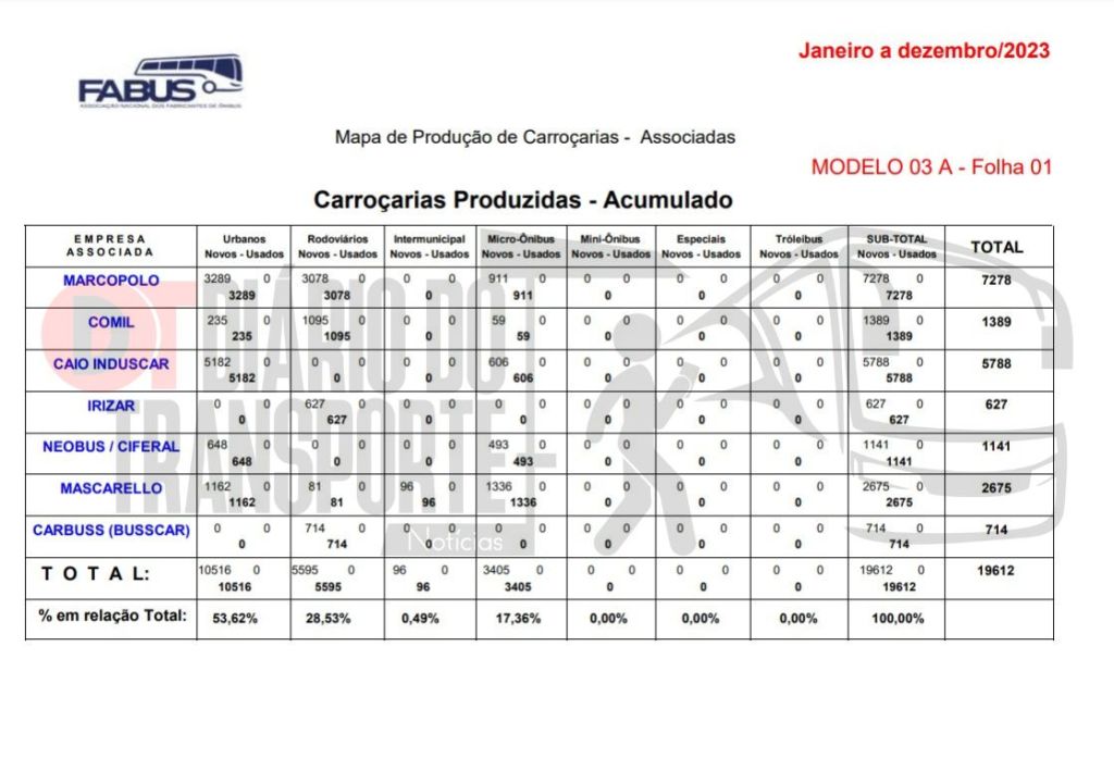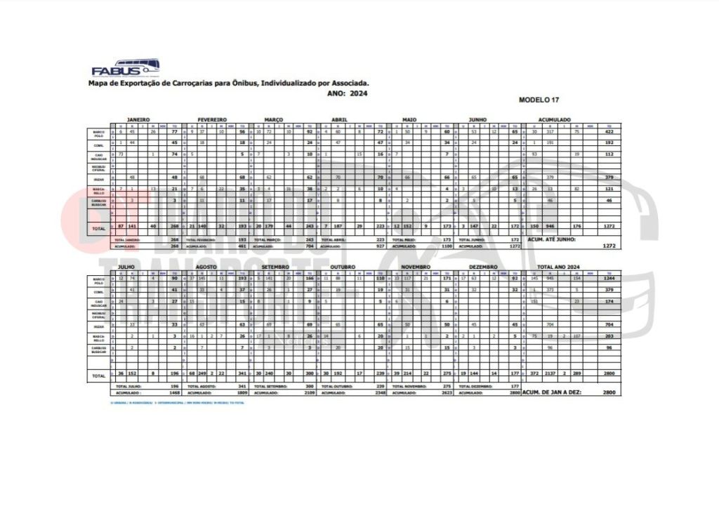 A produção de carrocerias de ônibus no Brasil registrou alta de 17,8% em 2024 na comparação com 2023, de acordo com a Fabus, associação que representa os fabricantes.