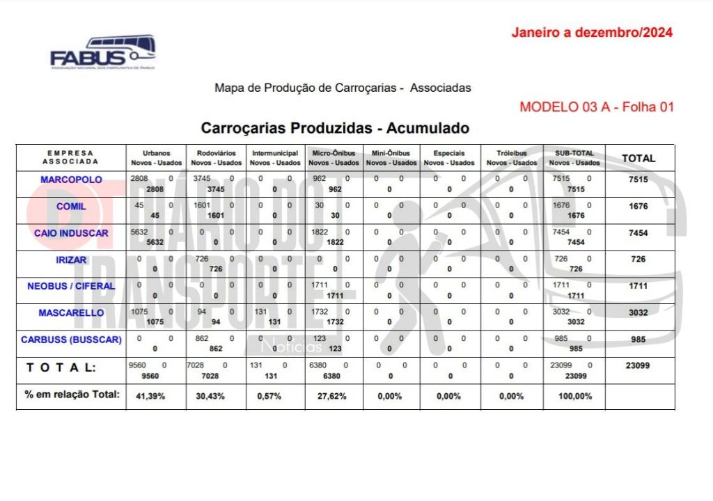 No ranking de marcas, Marcopolo lidera, que, levando em conta todas as suas operações de carrocerias, somou em 2024, 9.226 unidades, entre rodoviários, urbanos e micros.