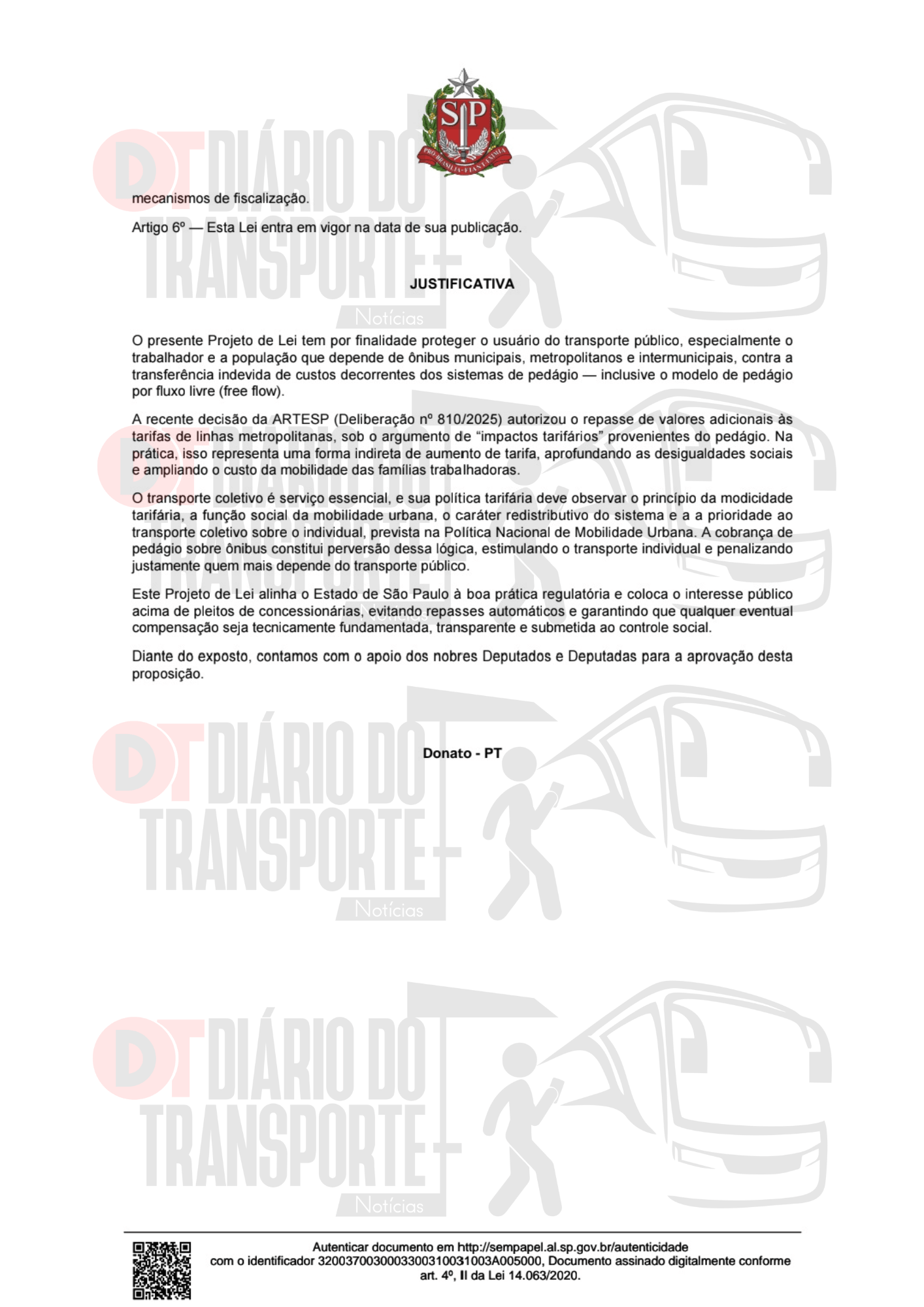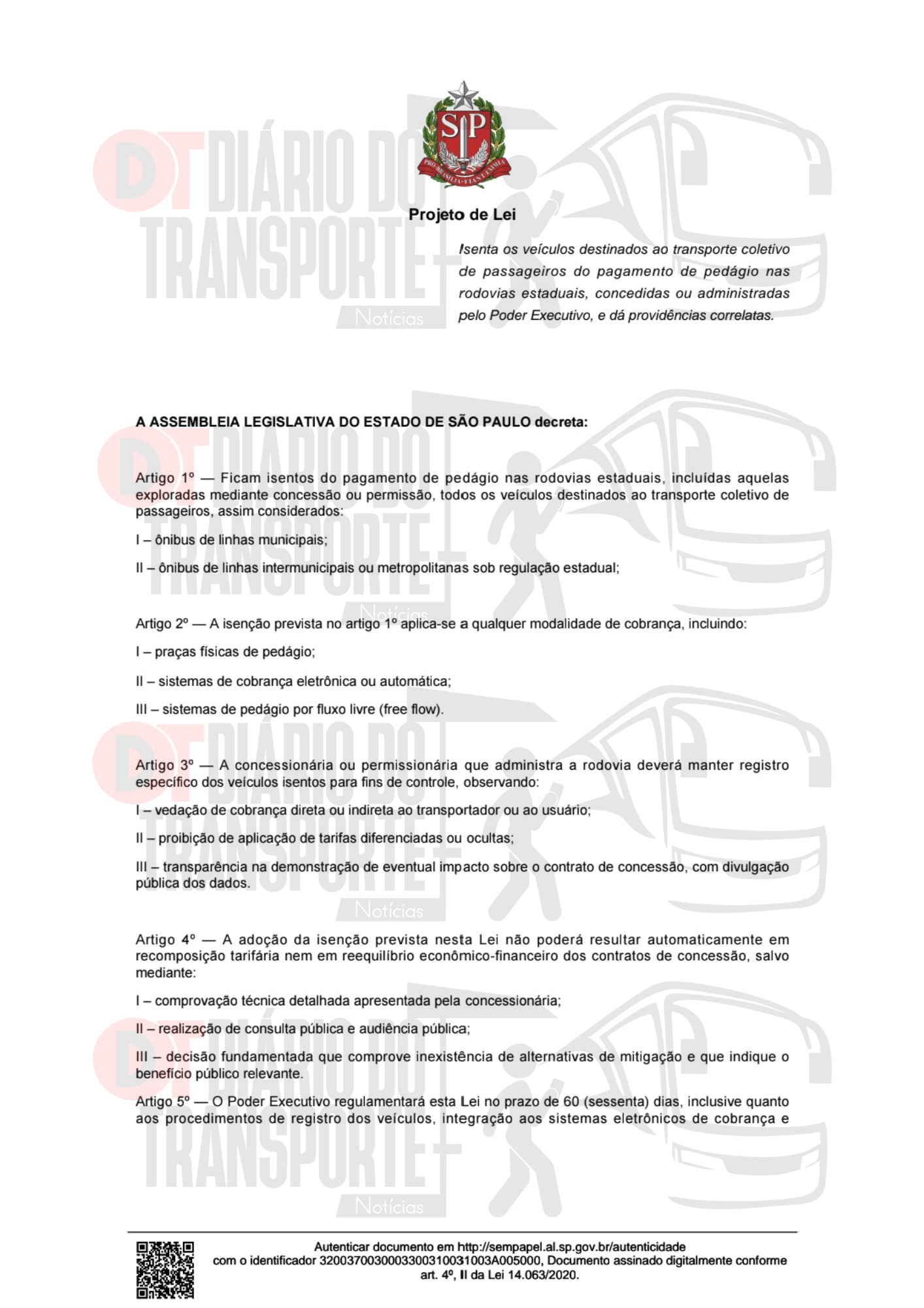 Para evitar que isso continue, já que o transporte coletivo contribui para a redução de carros nas vias e, consequentemente congestionamentos e poluição, um projeto de lei que foi apresentado na semana passada, na Alesp (Assembleia Legislativa do Estado de São Paulo), o Projeto de Lei 1352/202 de autoria do deputado Antonio Donato Madormo, que isenta dos pedágios ônibus regulares em operação.