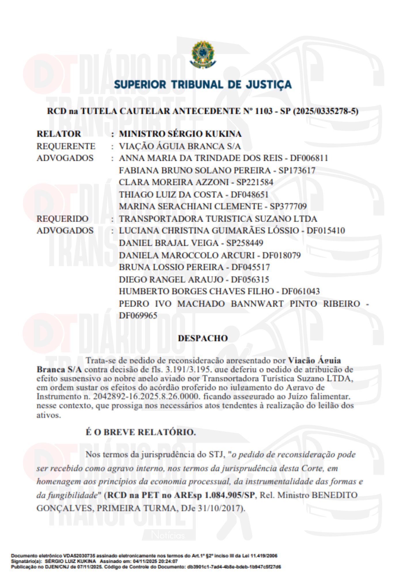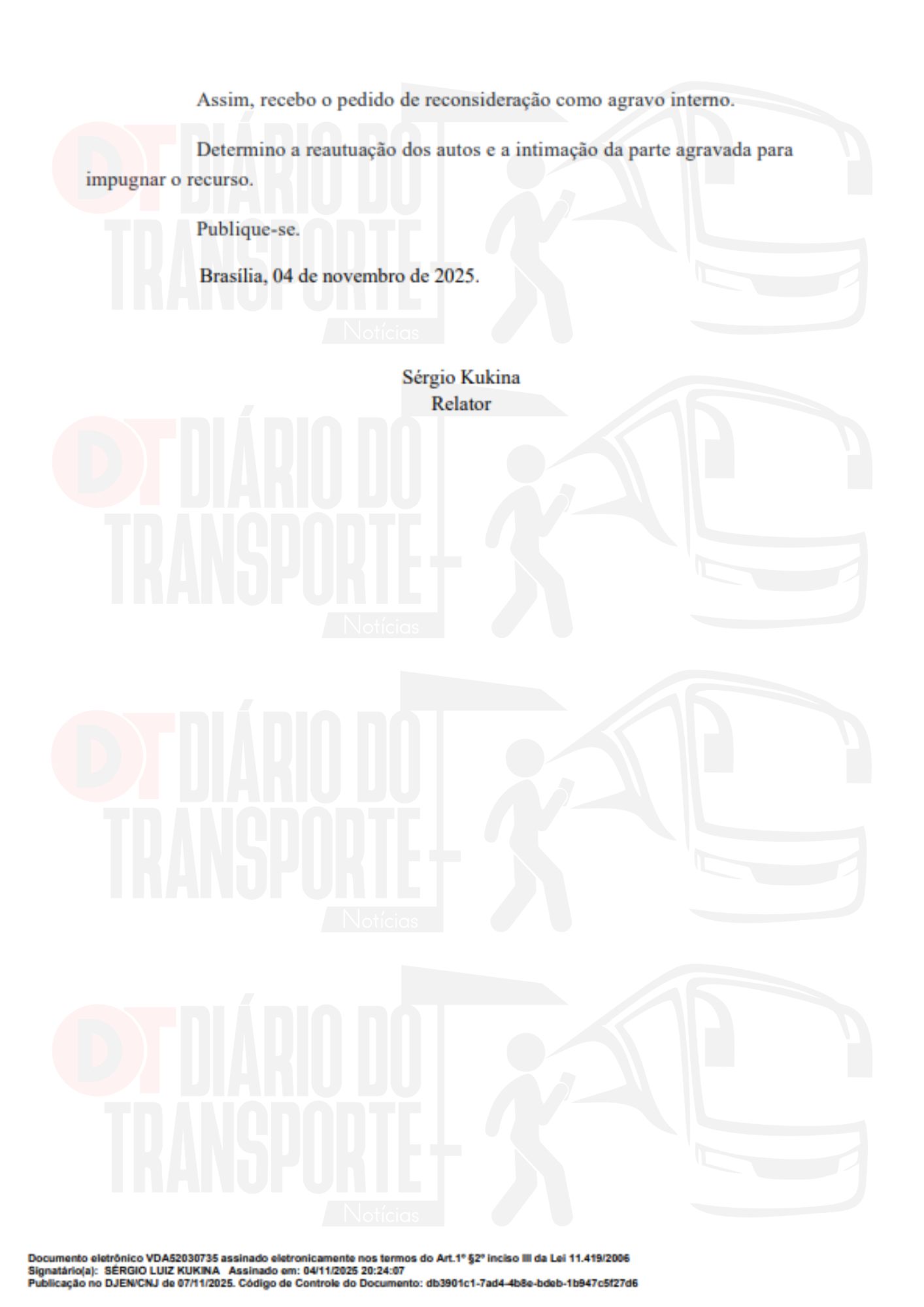Ainda como noticiou com exclusividade o Diário do Transporte, em 11 de setembro de 2025, com recurso de pedido de reconsideração no STJ (Superior Tribunal de Justiça) para tentar reverter a decisão do ministro relator, Sérgio Kukina.