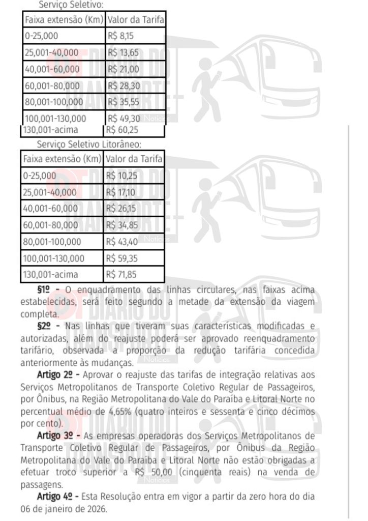 As tarifas de ônibus intermunicipais metropolitanos ficam, a partir de 06 de janeiro de 2026, no Vale do Paraíba e Litoral Norte da seguinte forma: