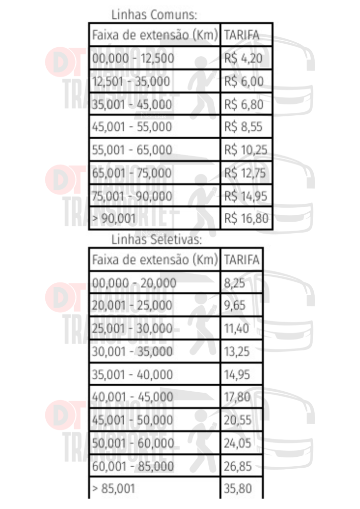 As comuns terão preços entre R$ 4,15 e R$ 12 e as seletivas entre R$ 9,05 e R$ 30,65, dependendo da extensão do trajeto e da área operacional.
