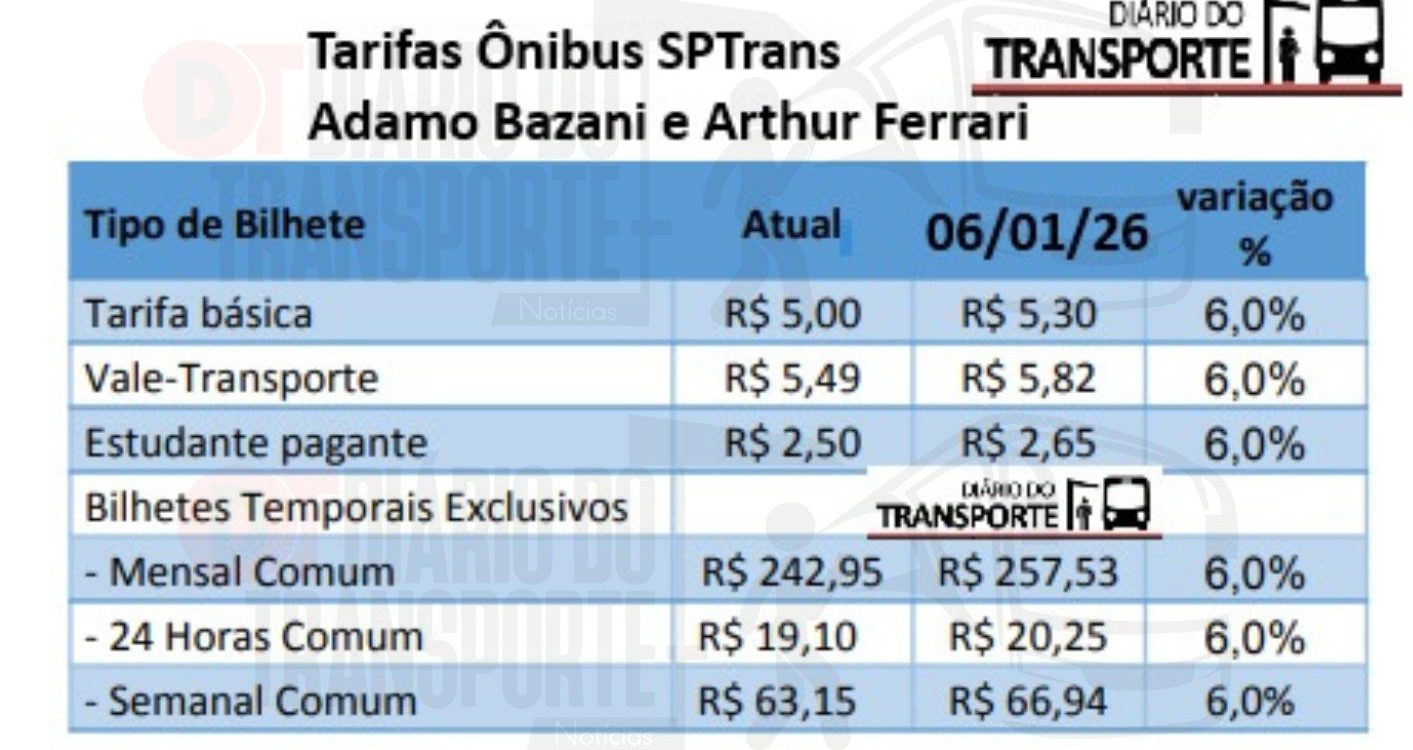 Nesta terça-feira, 06 de janeiro de 2026, é a vez de São Paulo reajustar a tarifa básica dos ônibus, que irá para R$ 5,30.