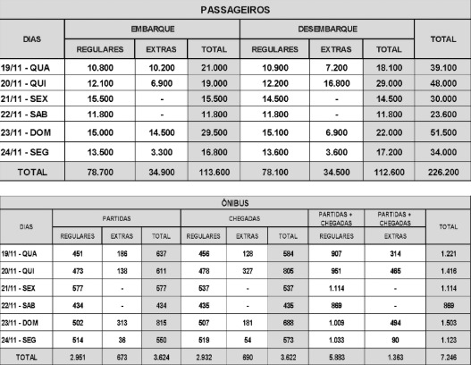 Para atender esta demanda, as 39 empresas de ônibus que operam no terminal disponibilizaram uma frota de 7.246 veículos, incluindo 1.363 ônibus extras.