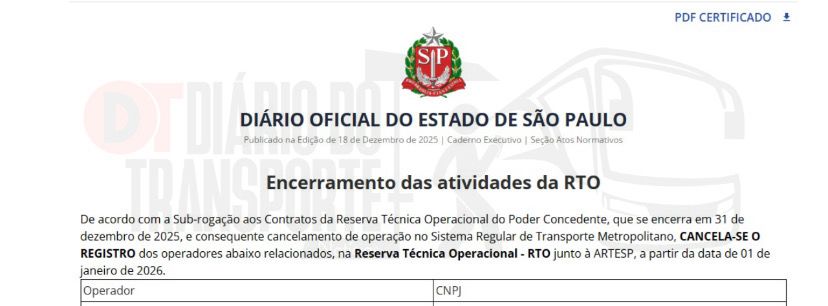 A confirmação oficial foi feita pela SPI (Secretaria de Parcerias em Investimentos), do Governo do Estado, ao Diário do Transporte nesta sexta-feira, 19 de dezembro de 2025. Nesta quinta-feira (18), foi publicado o ato normativo no Diário Oficial do Estado com os nomes dos donos de veículos que ainda prestavam serviços.