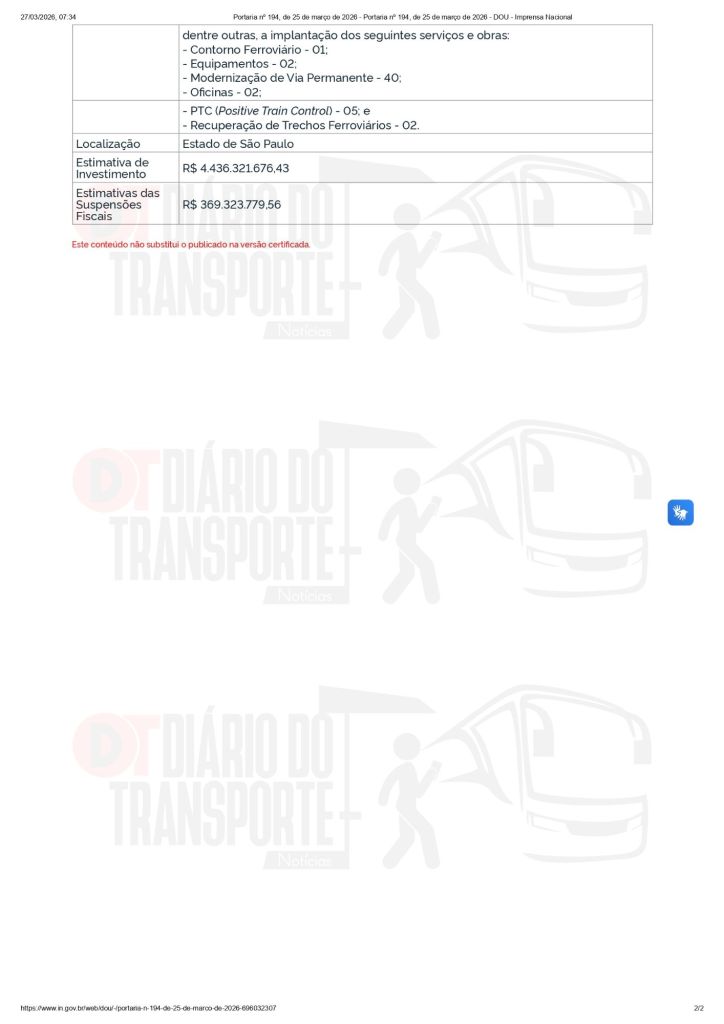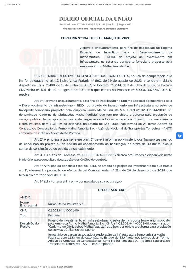 O Ministério dos Transportes aprovou o enquadramento do projeto de investimento da Rumo Malha Paulista S.A. no Regime Especial de Incentivos para o Desenvolvimento da Infraestrutura (REIDI). A medida foi oficializada pela Portaria nº 194, de 25 de março de 2026, publicada no Diário Oficial da União desta sexta-feira, 27 de março de 2026.