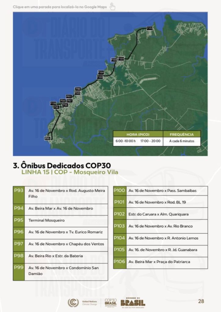 A Cop-30, Conferência Mundial sobre Mudanças Climáticas, que ocorre até o dia 21 de novembro de 2025 em Belém (PA) oferece para os participantes credenciados 15 linhas de ônibus especiais gratuitos para facilitar os deslocamentos de expositores, delegações oficiais e equipes de apoio.