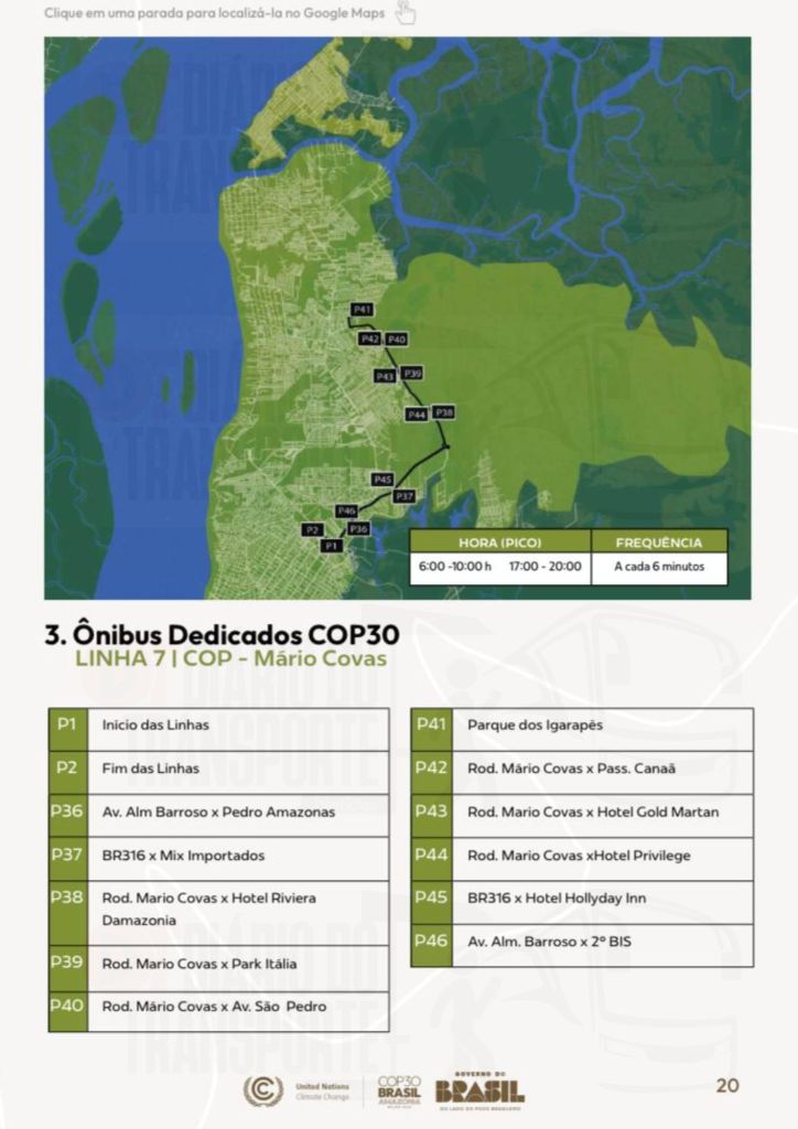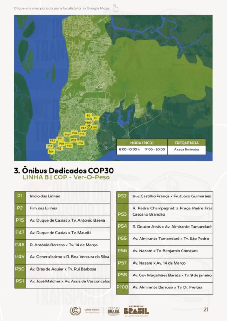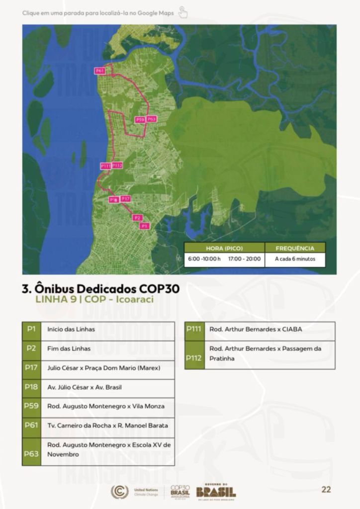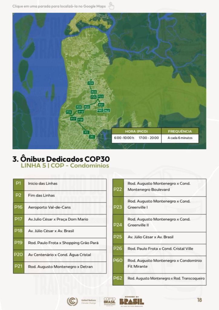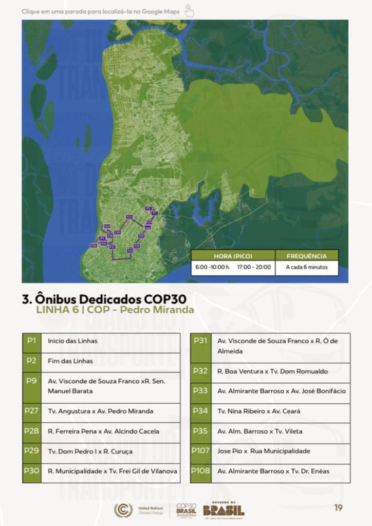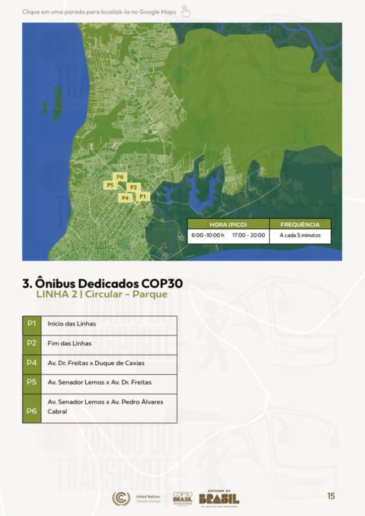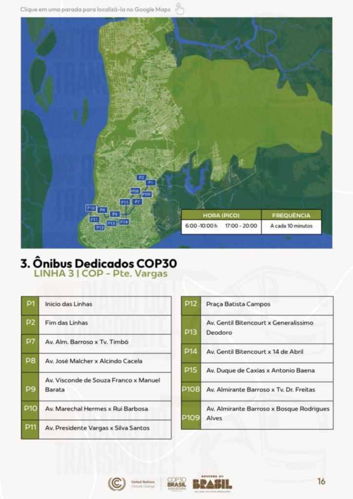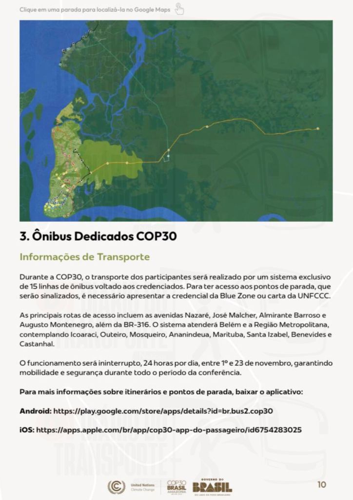 A Cop-30, Conferência Mundial sobre Mudanças Climáticas, que ocorre até o dia 21 de novembro de 2025 em Belém (PA) oferece para os participantes credenciados 15 linhas de ônibus especiais gratuitos para facilitar os deslocamentos de expositores, delegações oficiais e equipes de apoio.