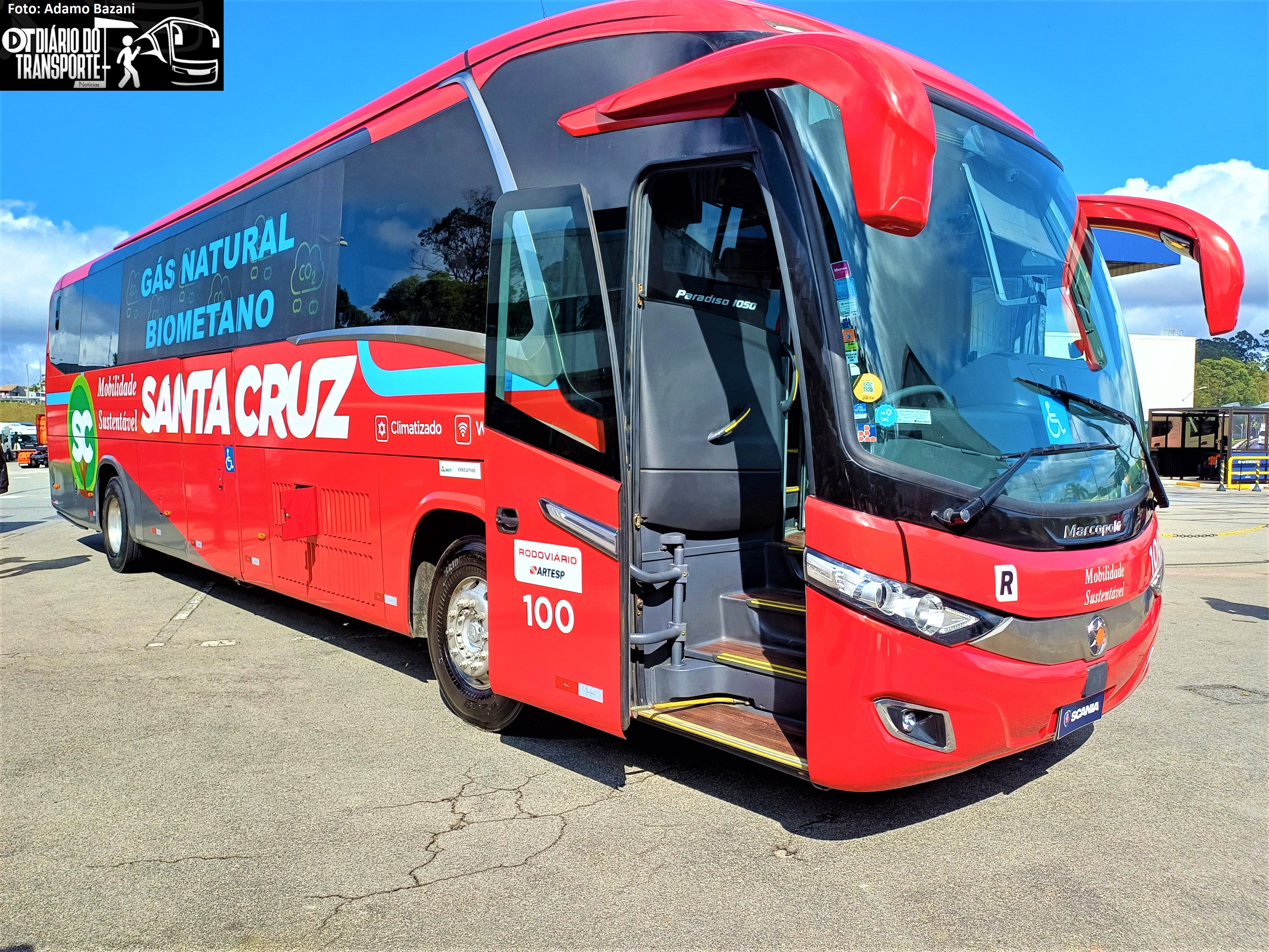 A Viação Santa Cruz, de Mogi Mirim, no interior de São Paulo, e a Scania apresentam na manhã desta quinta-feira, 12 de junho de 2025, um ônibus movido a biometano e gás natural; o nome técnico do chassi é K 340 4×2 GNC.