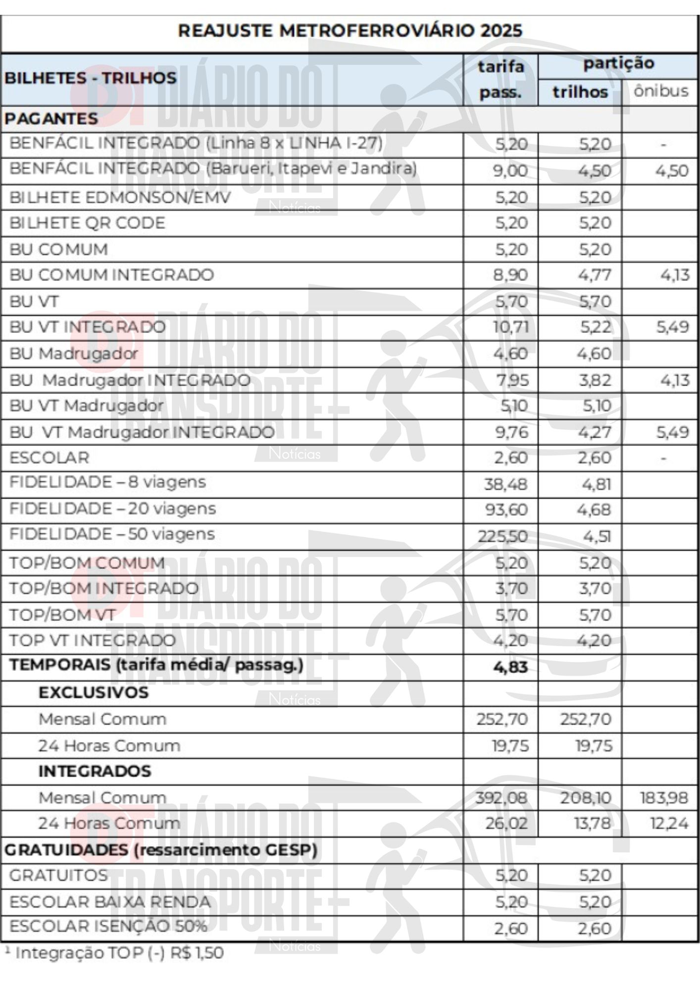 A tarifa do Vale-Transporte, paga pelos empregadores aos funcionários, passará para R$ 5,70 nos trens e metrô pelo Cartão TOP. A tarifa comum será de R$ 5,20. Há vários anos, o Vale-Transporte é mais caro que a modalidade comum.