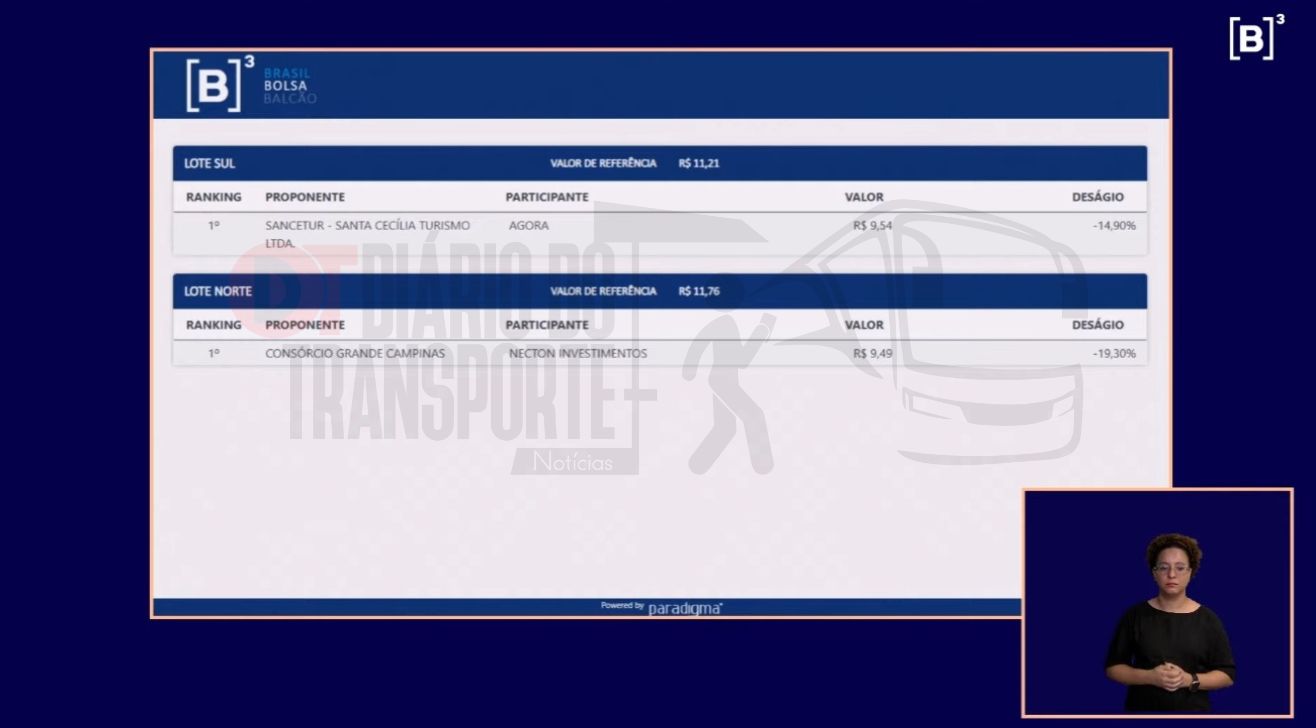 Para o lote Sul, a proposta da Sancetur foi de tarifa de remuneração de R$ 9,54 (deságio de 14,90% sobre o valor teto do edital de R$ 11,21).