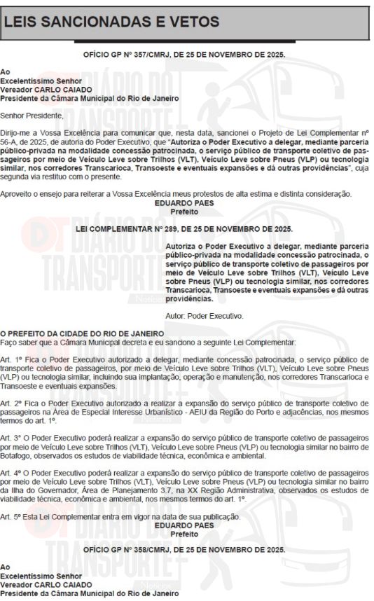 O prefeito do Rio de Janeiro, Eduardo Paes, sancionou lei complementar nº 289, de 25 de novembro de 2025, como resultado do projeto de lei complementar 56, que autoriza a administração municipal a trocar ônibus do BRT (Bus Rapid Transit) por VLT (Veículo Leve sobre Trilhos) ou VLP (Veículo Leve sobre Pneus).