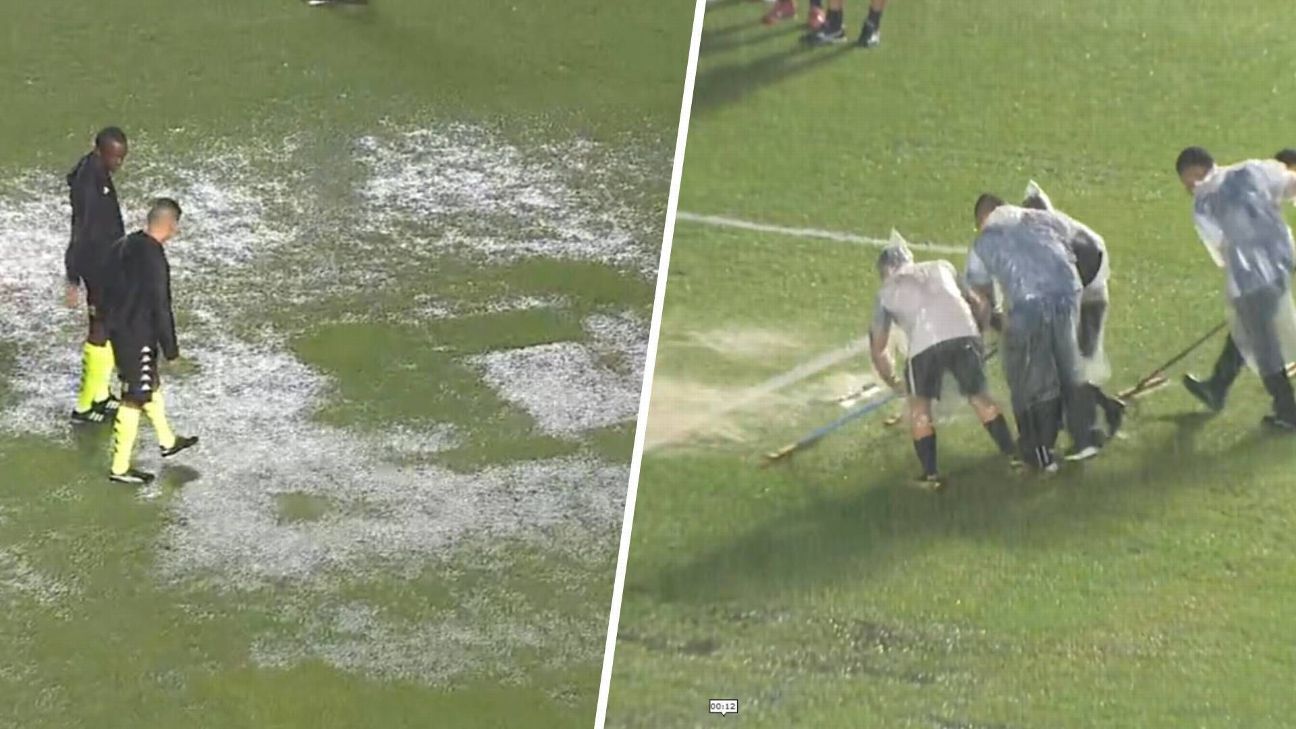 O gramado da Vila Belmiro não escapou da chuva que caiu na noite deste sábado (1º). Diversos pontos de alagamento no gramado impediram com que o jogo fosse iniciado no horário marcado.