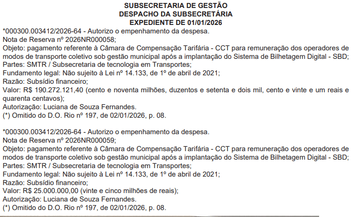 A Subsecretaria de Gestão da Secretaria Municipal de Transportes do Rio de Janeiro autorizou o empenhamento de R$ 215 milhões (R$ 215.272.121,40) para pagamento à Câmara de Compensação Tarifária (CCT), mecanismo responsável pela remuneração dos operadores de transporte coletivo sob gestão municipal após a implantação do Sistema de Bilhetagem Digital (SBD). A autorização consta no Diário Oficial desta quinta-feira, 12 de fevereiro de 2026.