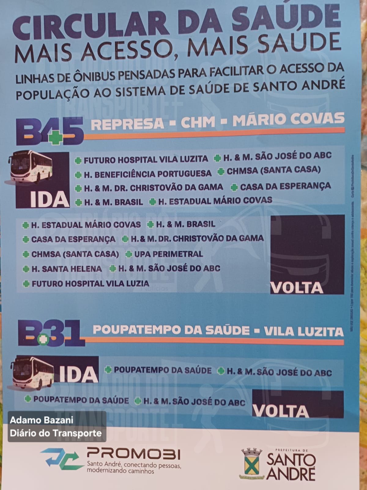 A chamada linha Circular da Saúde B45 (Represa – Vila Luzita /Paraíso – Hospital Mário Covas) conecta os principais hospitais da cidade como o Futuro Hospital Vila Luzita; H & M – Hospital e Maternidade São José do ABC; Hospital Beneficência Portuguesa; CHMSA – Centro Hospitalar Municipal de Santo André (Santa Casa – Hosp. Municipal); H & M– Hospital e Maternidade Dr. Christóvão da Gama; Casa da Esperança; H & M – Hospital e Maternidade Brasil; Hospital Mário Covas. (AO LONGO DA REPORTAGEM, VEJA TODAS AS RUAS ATENDIDAS)