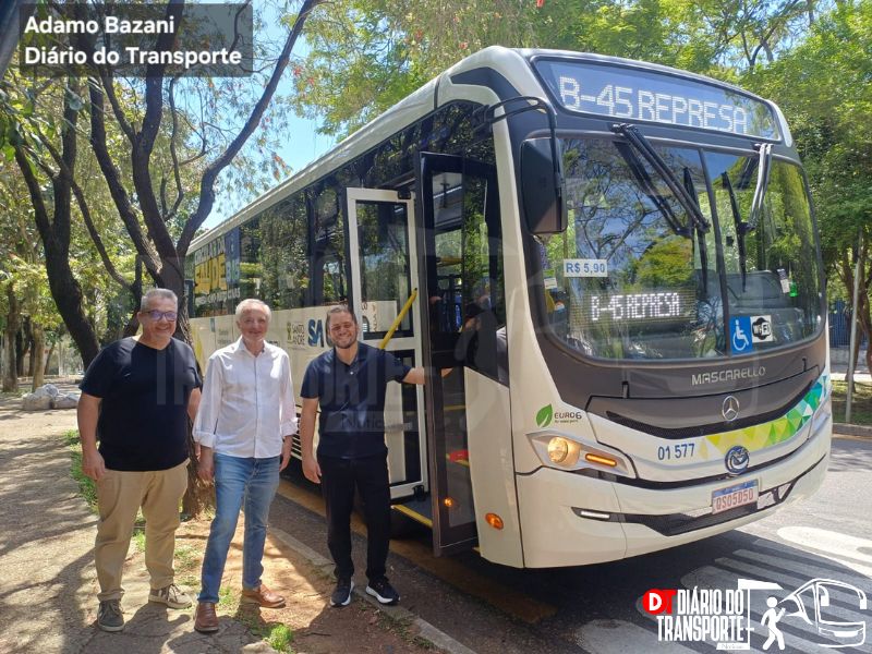 Da esquerda para a direita: Diretor de Transportes Públicos da SA TRANS (Santo André Transportes), Ageu Padoveze; secretário de Mobilidade Urbana, Almir Cicote (ao centro de camisa e o prefeito de Santo André, Gilvan Ferreira (ao lado do ônibus), no ponto final do Bairro Paraíso.