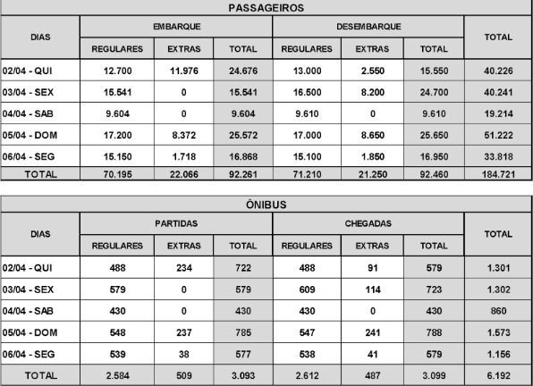 Na semana que vem o movimento de passageiros pela Rodoviária do Rio começa a se intensificar já que muita gente se programa para viajar durante o feriado da Semana Santa. De 2 a 6 de abril, o terminal deve receber 184.721 viajantes. O dia com maior movimento de saída do Rio pelo terminal será a quinta-feira (2 de abril), com 24.676 embarques. Já a sexta, concentra maior número de chegadas, com 24.700 pessoas desembarcando. Para atender esta demanda, as 39 empresas de ônibus que operam no terminal disponibilizaram uma frota de 6.192 veículos, incluindo 996 ônibus extras.