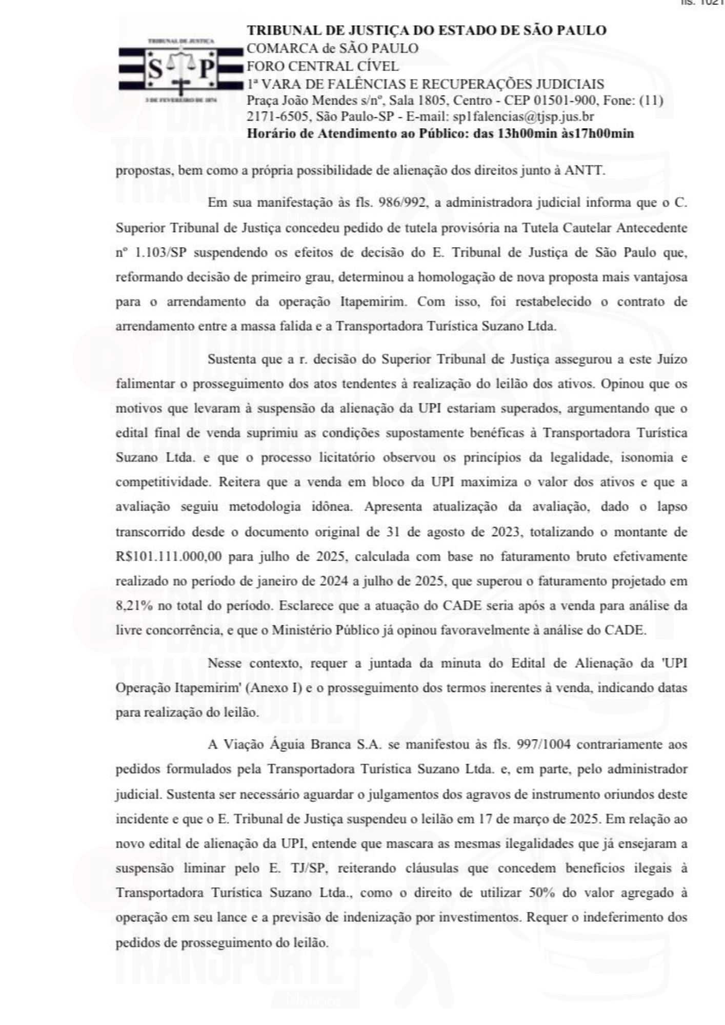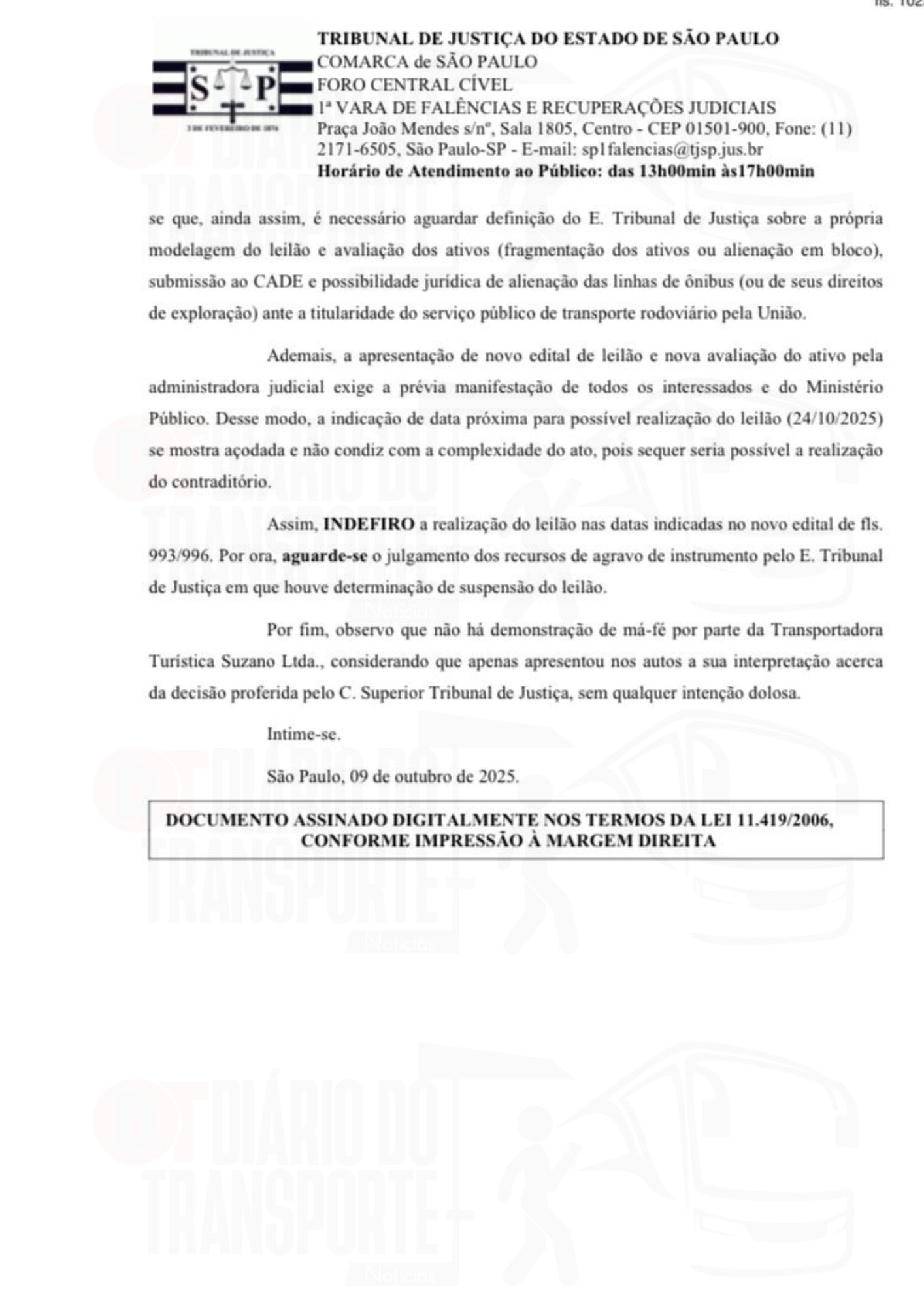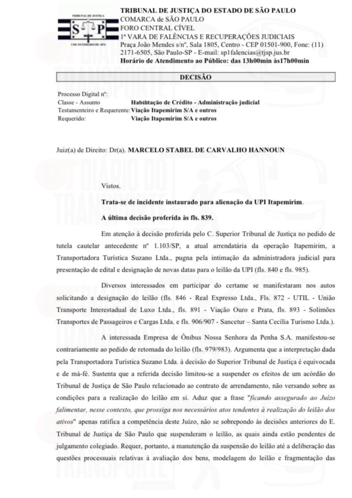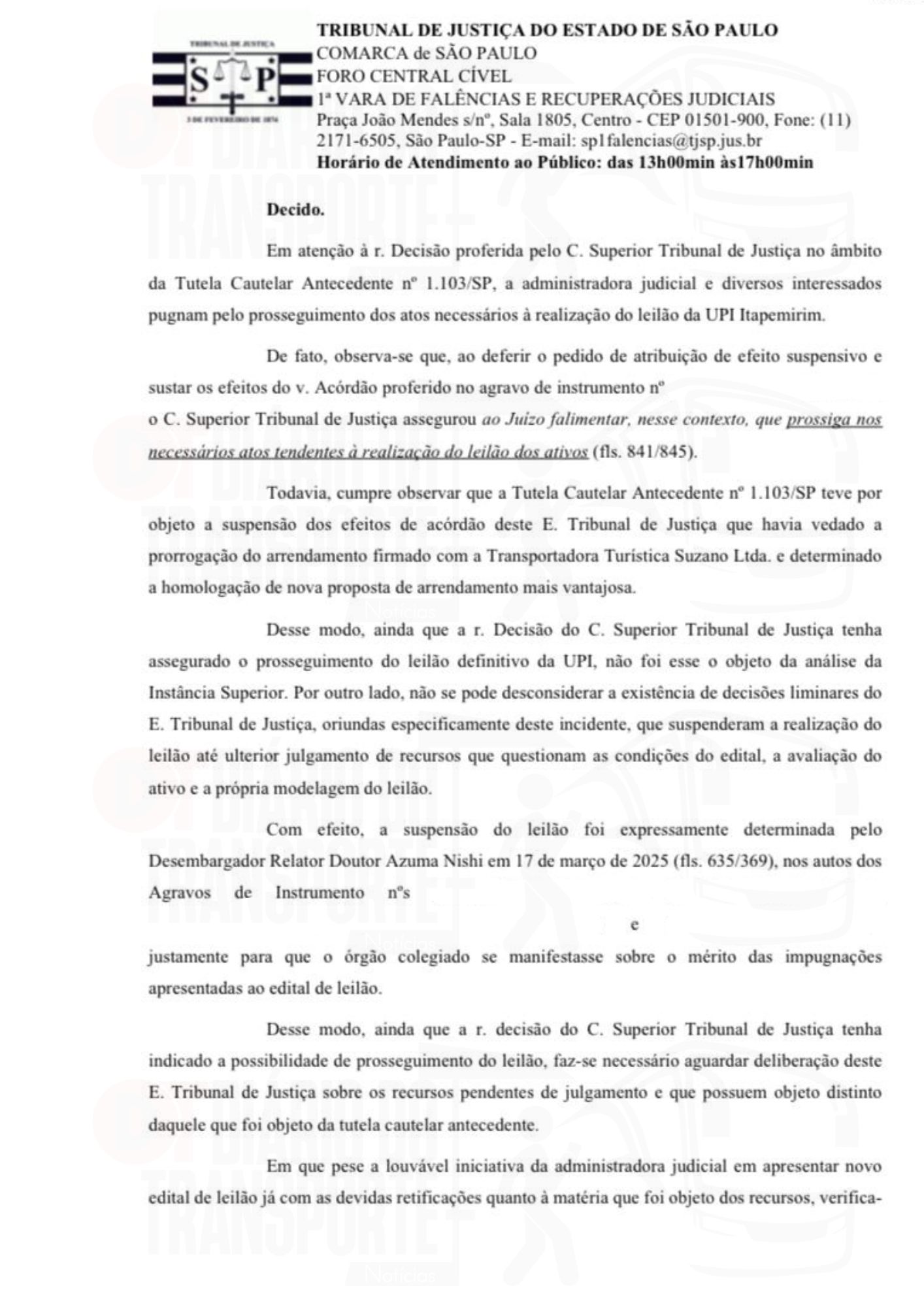 Por fim, observo que não há demonstração de má-fé por parte da TransportadoraTurística Suzano Ltda., considerando que apenas apresentou nos autos a sua interpretação acercada decisão proferida pelo C. Superior Tribunal de Justiça, sem qualquer intenção dolosa – escreveu o magistrado, que ainda destacou que CADE (Conselho Administrativo de Defesa Econômica), do Ministério da Justiça, que o Ministério Público e que a ANTT (Agência Nacional de Transportes Terrestres), que regula o setor, não se manifestaram sobre o novo edital sugerido pela administradora judicial do processo de falência, EXM Partners.
