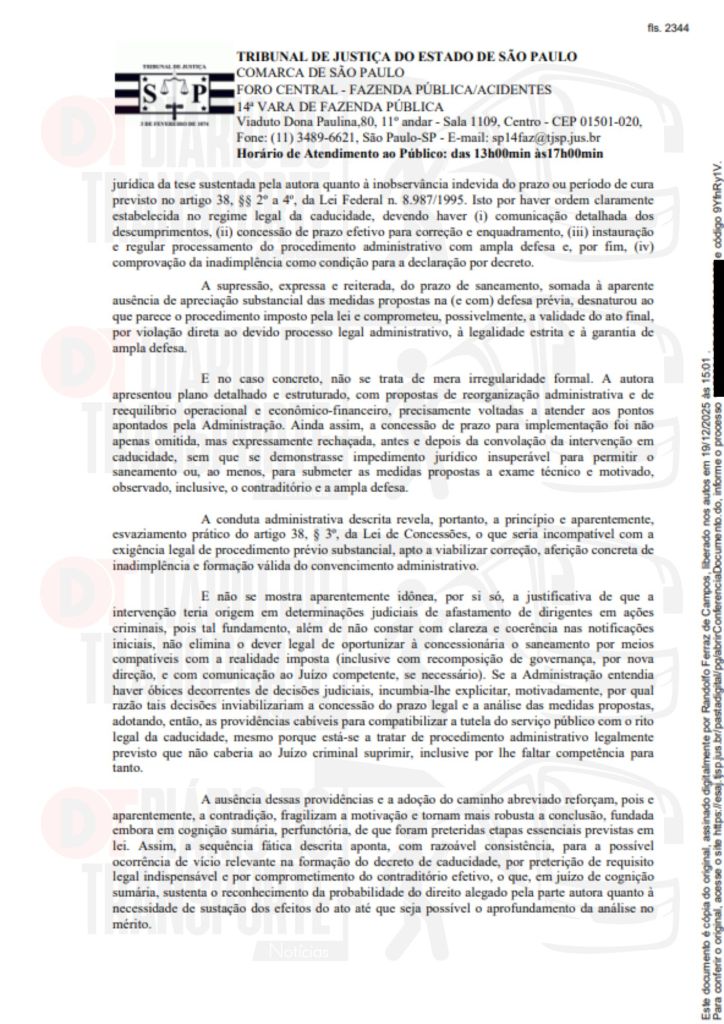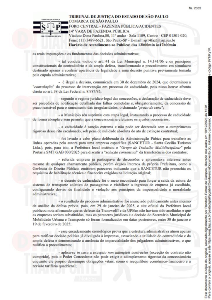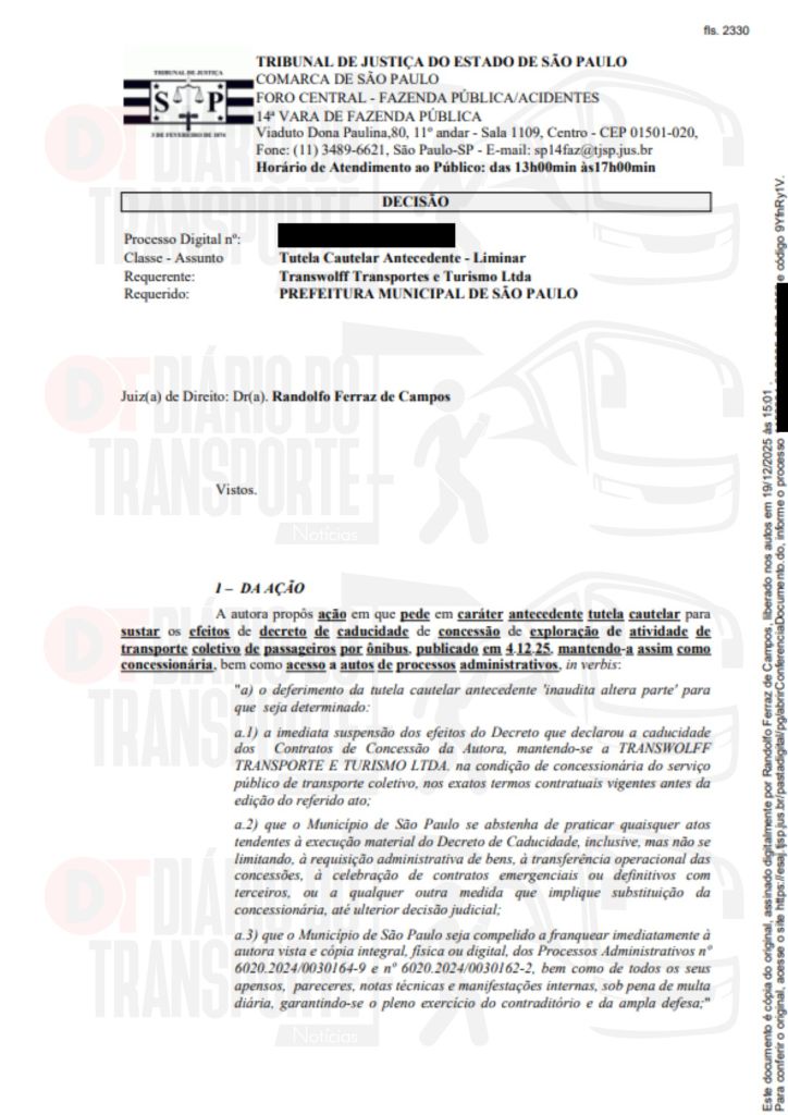 O juiz Randolfo Ferraz de Campos, da 14ª Vara da Fazenda Pública da capital paulista atendeu há pouco (na tarde desta sexta-feira, 19 de dezembro de 2025), a defesa da empresa de ônibus Transwolff, da zona Sul, e suspendeu o decreto do prefeito Ricardo Nunes que quebrou os contratos com a viação, que estava sob intervenção e foi alvo de uma operação do Ministério Público de São Paulo que investiga suposto envolvimento da direção da transportadora de passageiros com a facção criminosa PCC (Primeiro Comando da Capital) e cujo processo de finalização de contrato está entre as principais suspeitas da onde de ataques contra 1,5 mil ônibus no Estado no meio do ano.