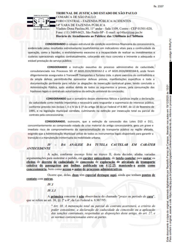 A Prefeitura de São Paulo informou na noite de 04 de dezembro de 2025, o decreto que determina a caducidade dos contratos com a concessionária de ônibus Transwolff.