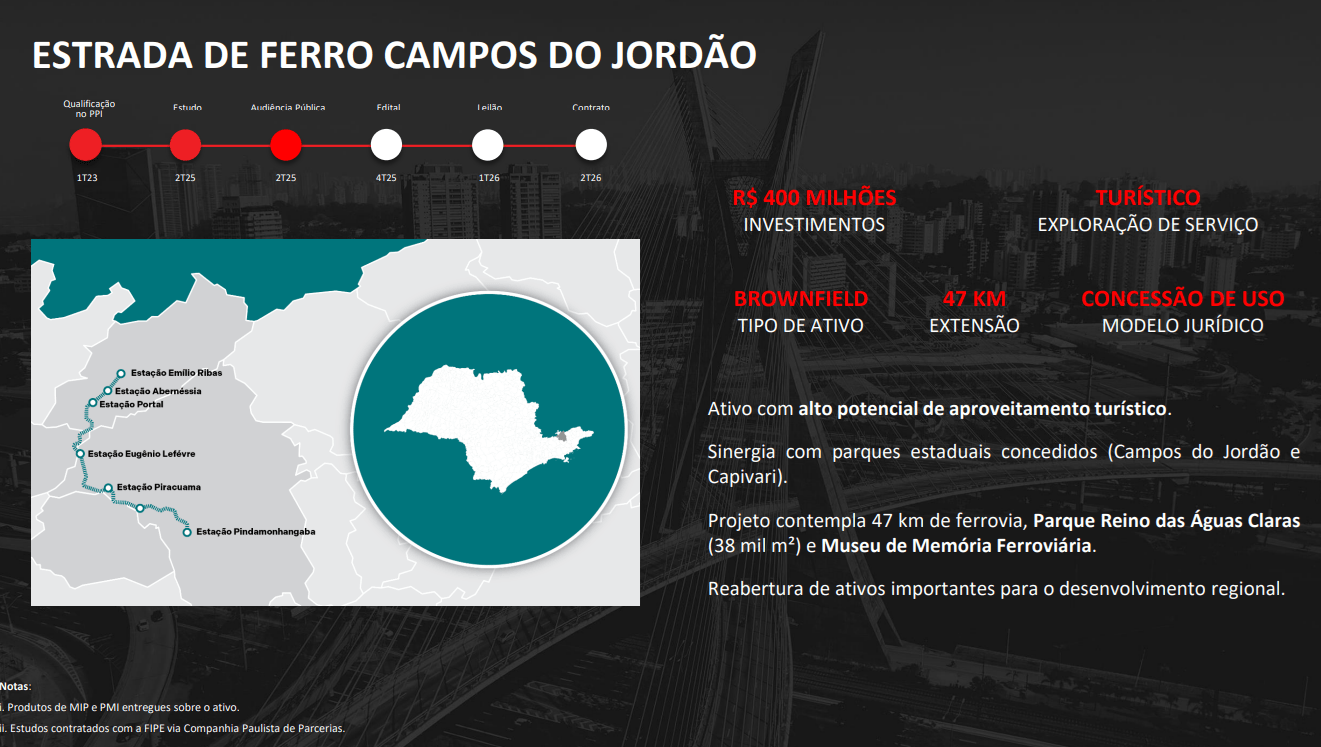 A Estrada de Ferro Campos do Jordão já foi formalmente qualificada pela SPI para concessão. O edital da Concorrência Internacional nº 03/2025, publicado pela Pasta, confirma que o projeto foi analisado, discutido com a sociedade e aprovado pelo Conselho Gestor, abrindo a licitação para a Concessão de Uso do Complexo Turístico Ferroviário da EFCJ.