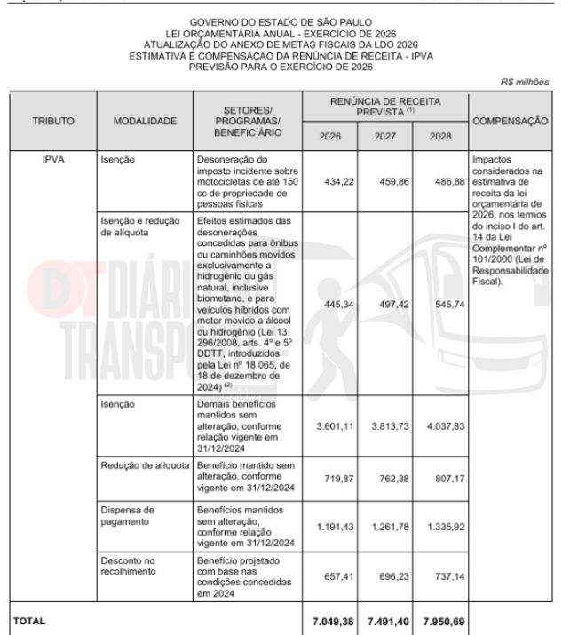Na proposta original, somente ainda considerando  a versão que contemplava 2,4 milhões de motocicletas de até 150 cilindradas, e levando em conta as outras renúncias conforme a tabela abaixo, o governador mostra a Alesp (Assembleia Legislativa do Estado de São Paulo) uma estimativa de deixar de arrecadar R$ 7 bilhões já no primeiro ano, em 2026; se aproximando de R$ 8 bilhões em 2028. Não houve, no projeto original, a estimativa de renúncia fiscal para a lei que passa a vigorar de fato e abrange uma frota maior de motos, de 4,3 milhões destes veículos.