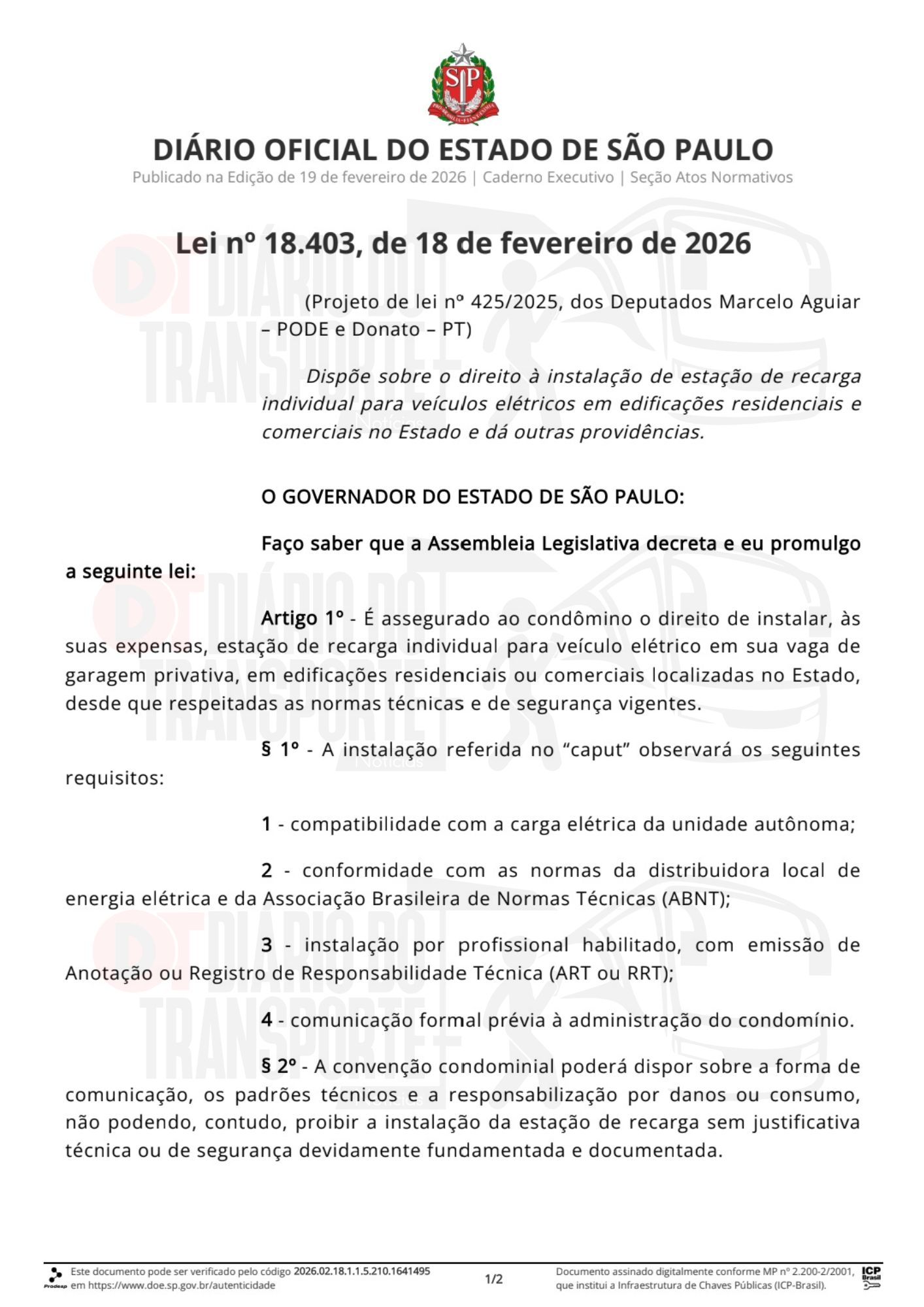 O governador de São Paulo, Tarcísio de Freitas, sancionou projeto de lei que proíbe que condomínios e edifícios comerciais impeçam instalações para recarga de veículos elétricos no Estado de São Paulo.