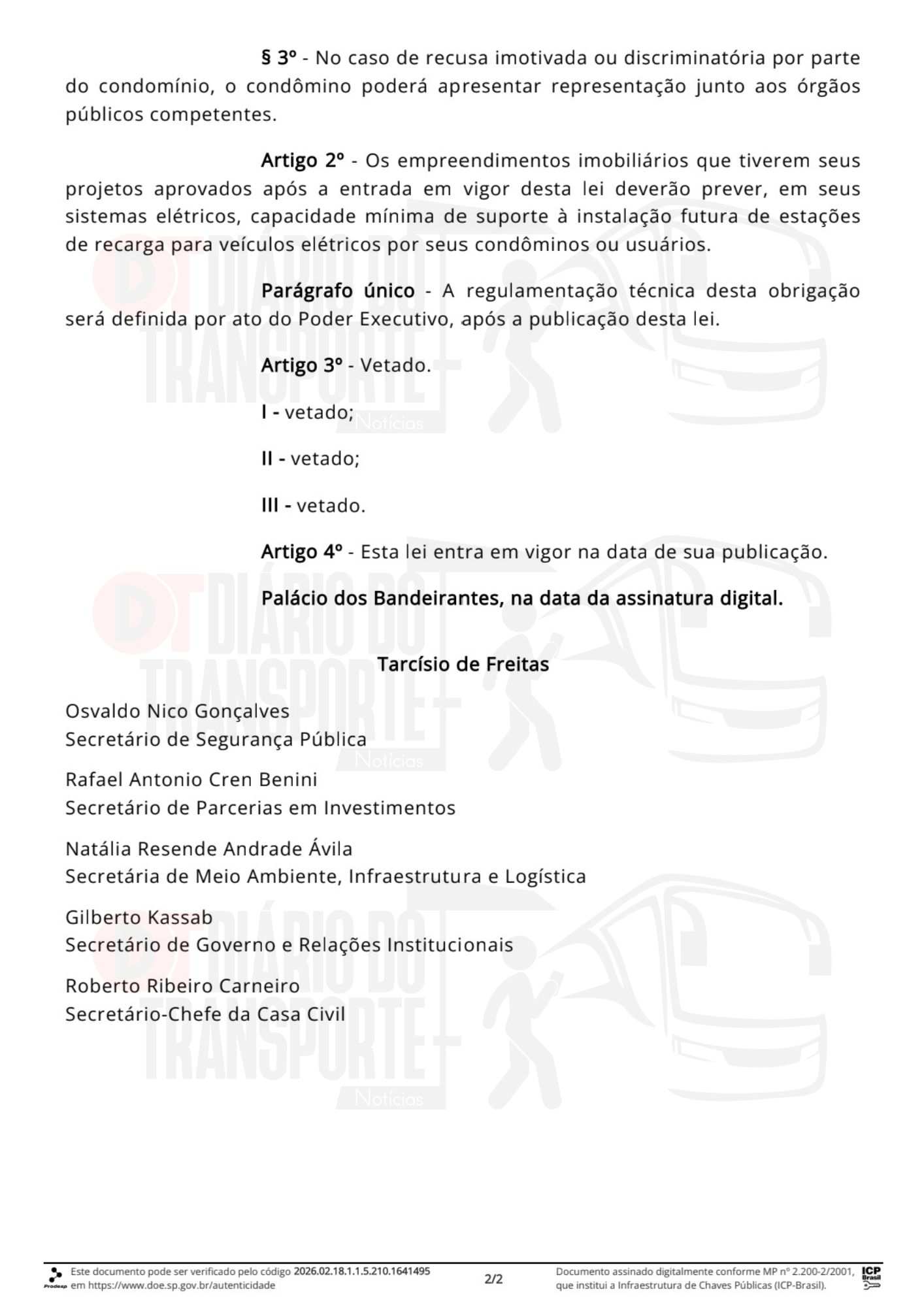 O governador de São Paulo, Tarcísio de Freitas, sancionou projeto de lei que proíbe que condomínios e edifícios comerciais impeçam instalações para recarga de veículos elétricos no Estado de São Paulo.
