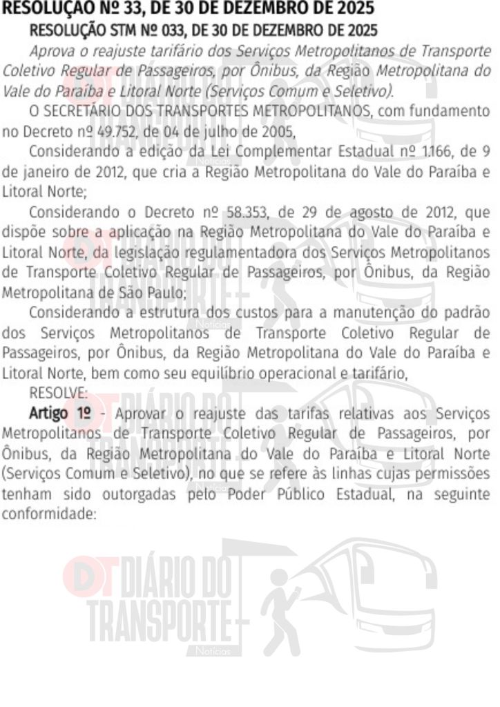 As tarifas de ônibus intermunicipais metropolitanos ficam, a partir de 06 de janeiro de 2026, no Vale do Paraíba e Litoral Norte da seguinte forma: