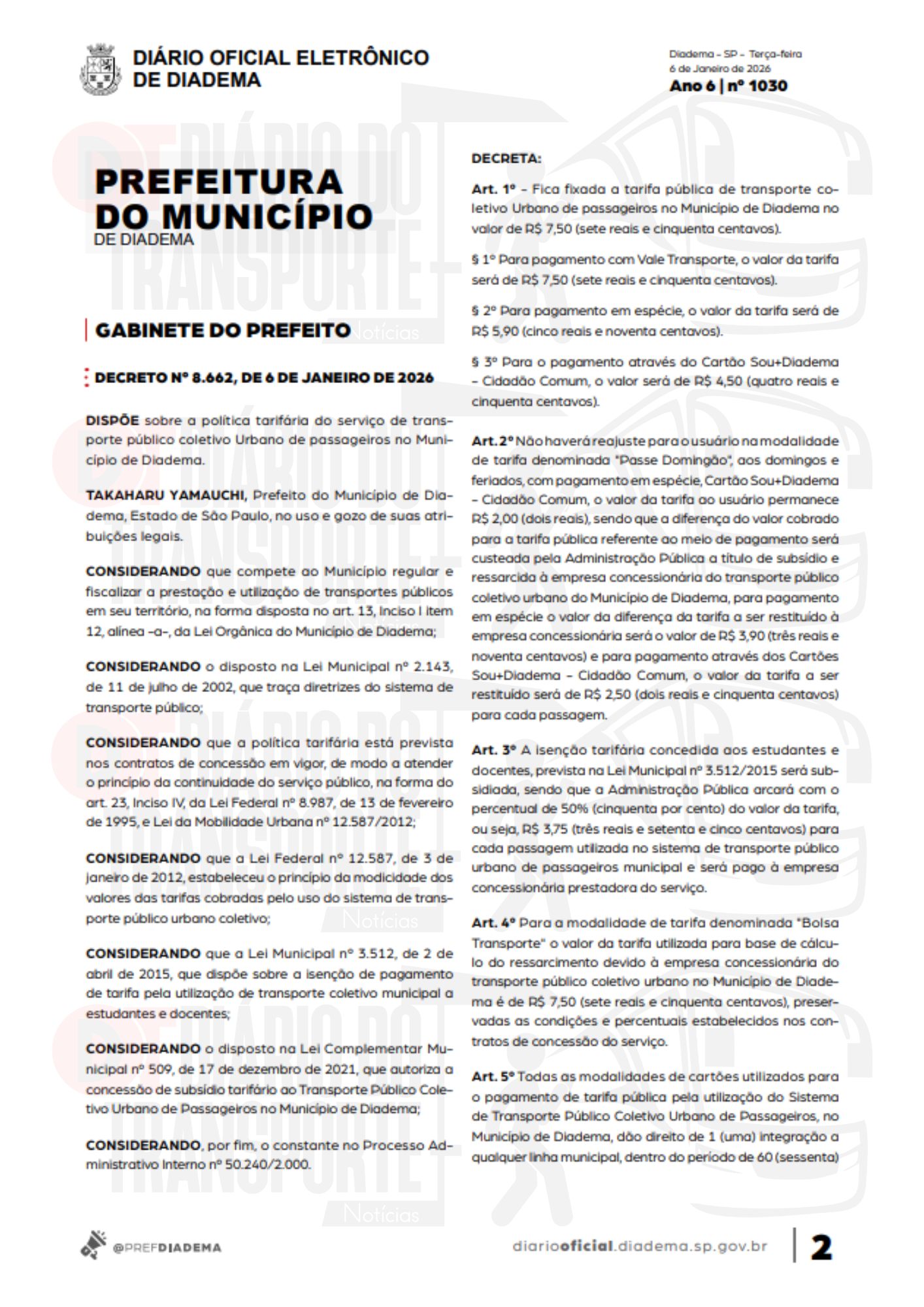No dia 12 de janeiro de 2026, a tarifa de ônibus municipais de Diadema, no ABC Paulista, tem reajuste.