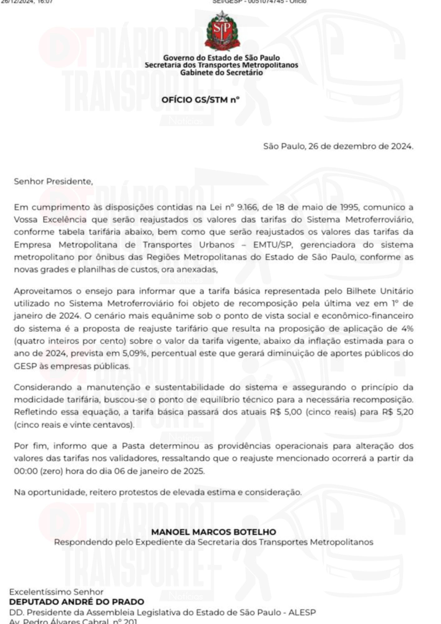 A partir de 00h de 06 de janeiro de 2025 de R$ 5 para R$ 5,20, aumento de 4%. O mais recente reajuste tinha sido em janeiro de 2024, quando o valor tinha ido de R$ 4,40 para R$ 5 depois de três anos de congelamento. As integrações com os ônibus municipais da capital paulista (SPTrans) e as demais modalidades, como tarifas temporais, também têm reajuste. Isso vale para as linhas de operação pública (CPTM e Metrô) e de operação privada (ViaMobilidade e ViaQuatro)
