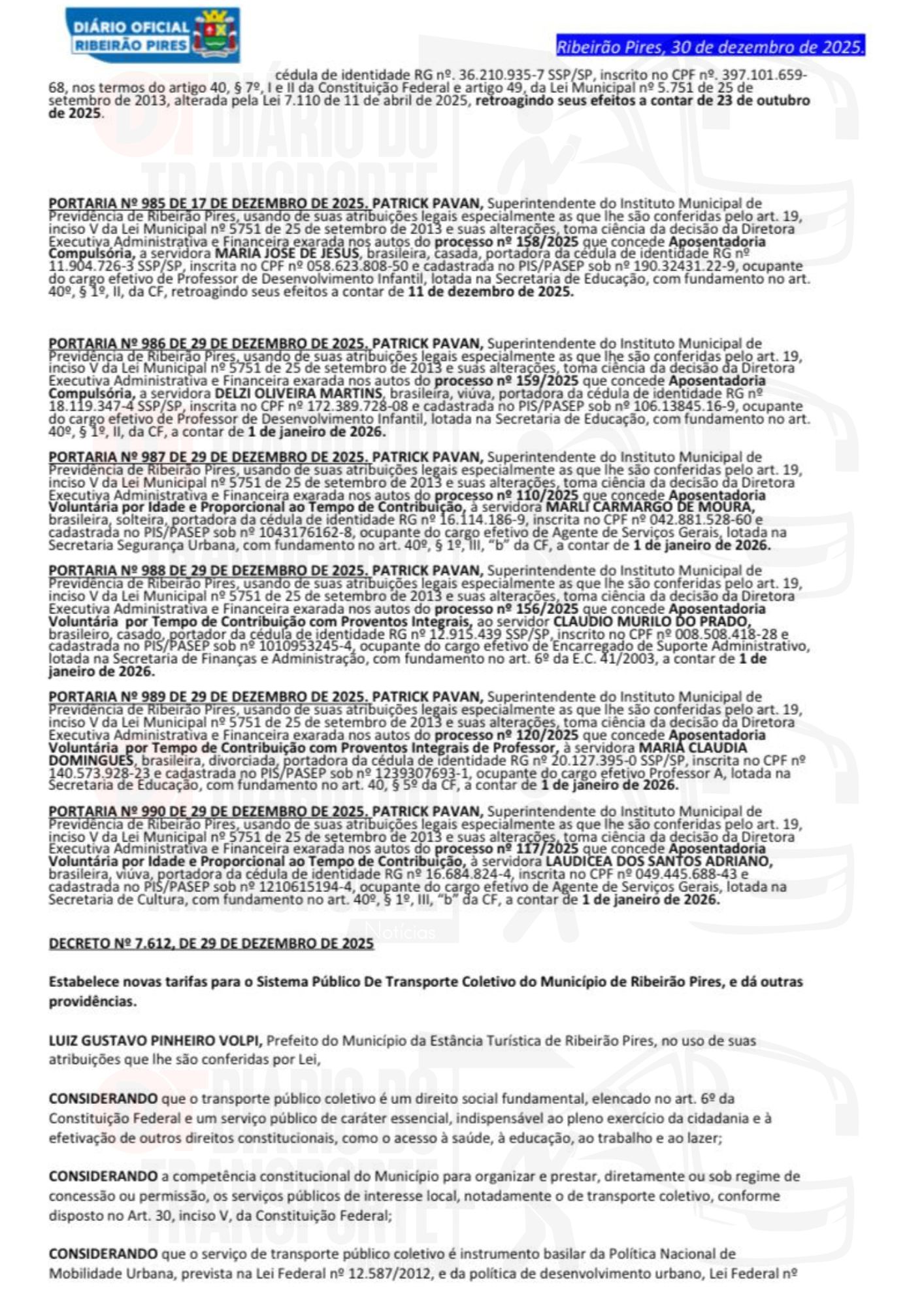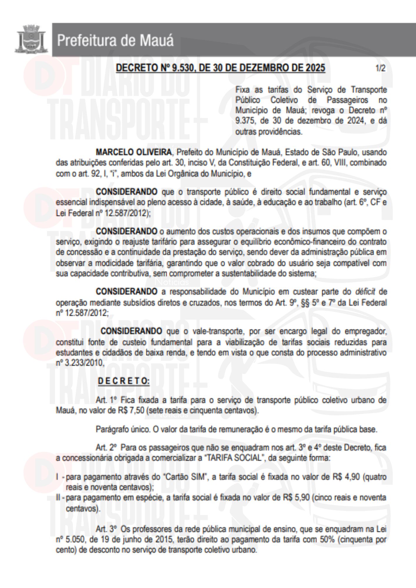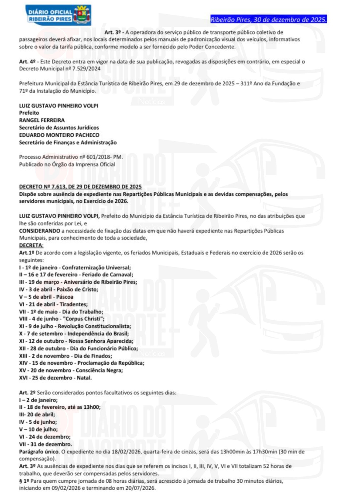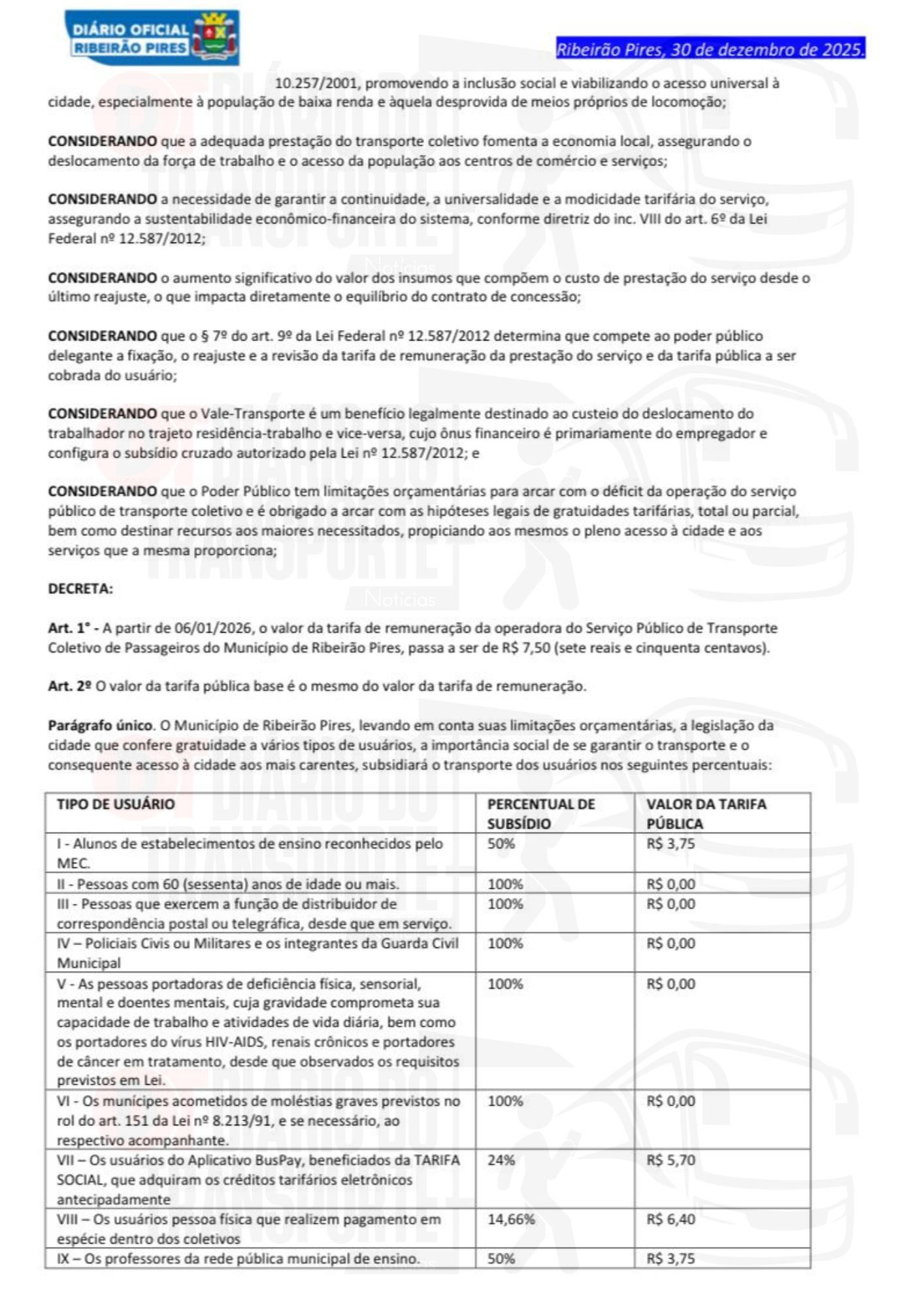 O decreto com os reajustes em Ribeirão Pires, que entra em vigor no dia 06 de janeiro de 2026, foi publicado pelo prefeito Clóvis Volpi nesta terça-feira, 30 de dezembro de 2025 e é informado em primeira-mão pelo Diário do Transporte.