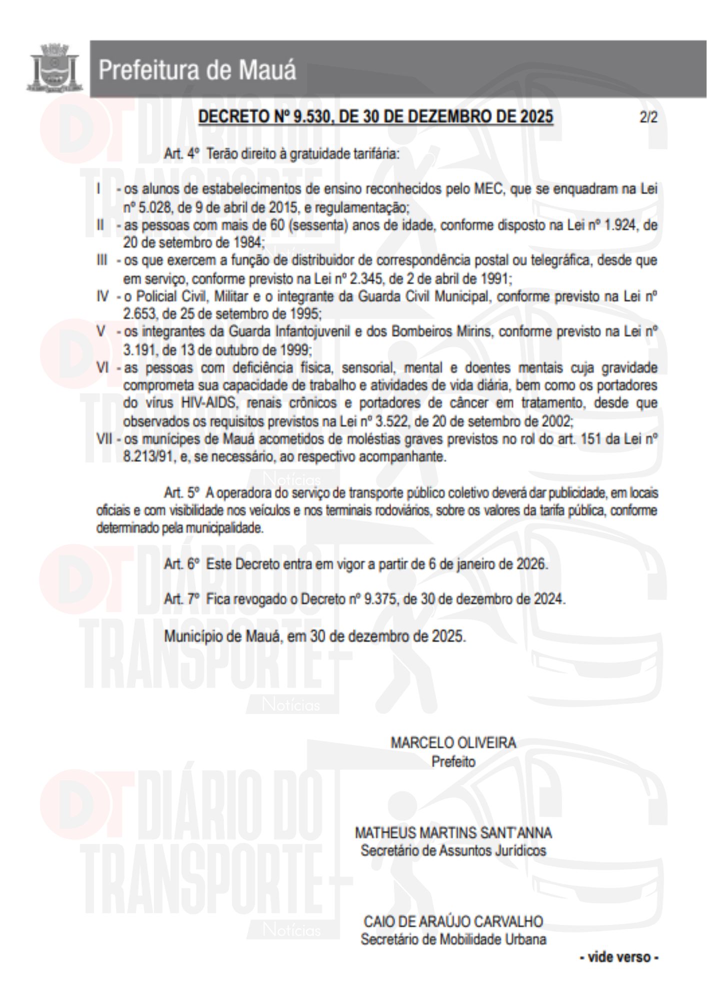 O decreto do prefeito Marcelo Oliveira foi publicado no início da noite desta terça-feira, 30 de dezembro de 2025 e o Diário do Transporte informa em primeira-mão.
