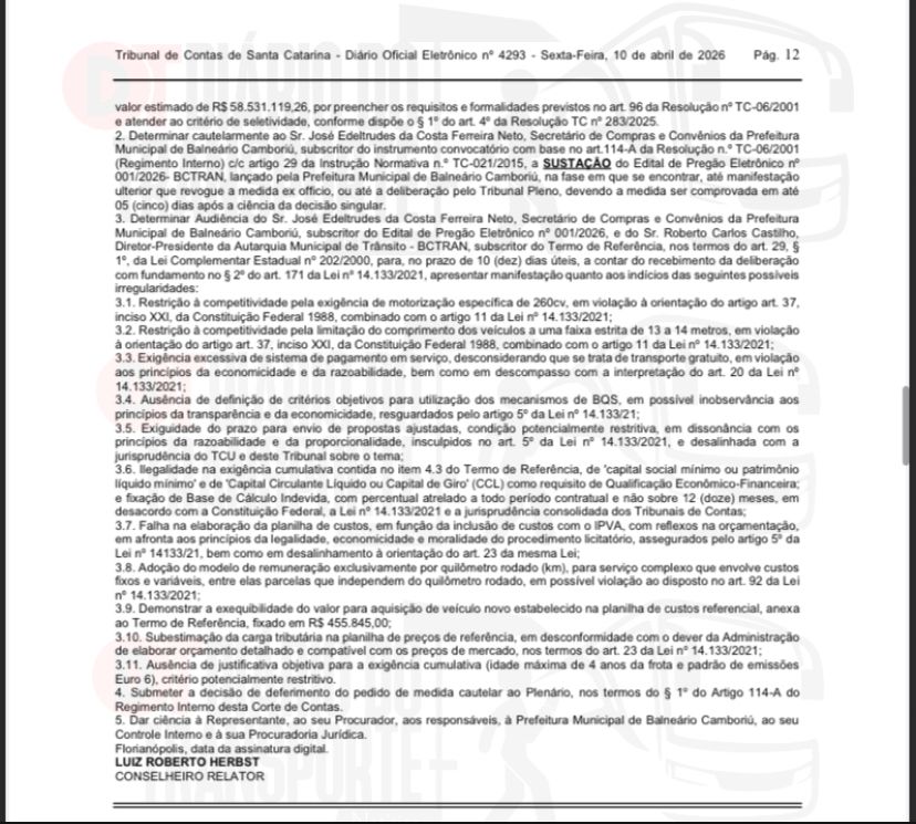 O Tribunal de Contas de Santa Catarina (TCE-SC) determinou a suspensão da licitação do programa Tarifa Zero em Balneário Camboriú. A decisão foi publicada no Diário Oficial da Corte nesta sexta-feira, 10 de abril de 2026, e atinge o Pregão Eletrônico nº 001/2026, que trata da contratação de empresa para operar o transporte público gratuito no município.