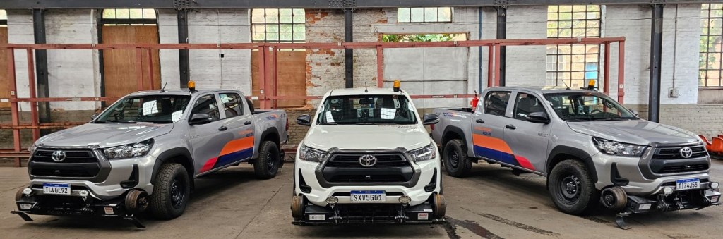 A frota para prestação de serviços na Linha 7-Rubi já conta com picapes, vans, motocicletas, retroescavadeiras rodoferroviárias e pá carregadeira rodoviária.