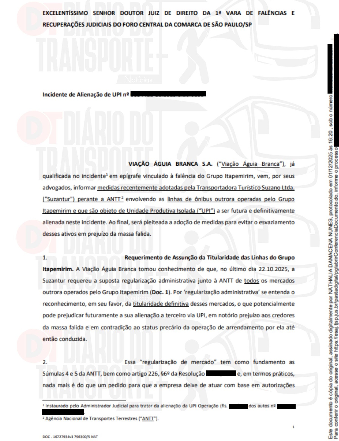 Requerimento de Assunção da Titularidade das Linhas do Grupo Itapemirim. A Viação Águia Branca tomou conhecimento de que, no último dia 22.10.2025, a Suzantur requereu a suposta regularização administrativa junto à ANTT de todos os mercados outrora operados pelo Grupo Itapemirim (Doc. 1). Por ‘regularização administrativa’ se entenda o reconhecimento, em seu favor, da titularidade definitiva desses mercados, o que potencialmente pode prejudicar futuramente a sua alienação a terceiro via UPI, em notório prejuízo aos credores da massa falida e em contradição ao status precário da operação de arrendamento por ela até então conduzida – diz trecho da denúncia.