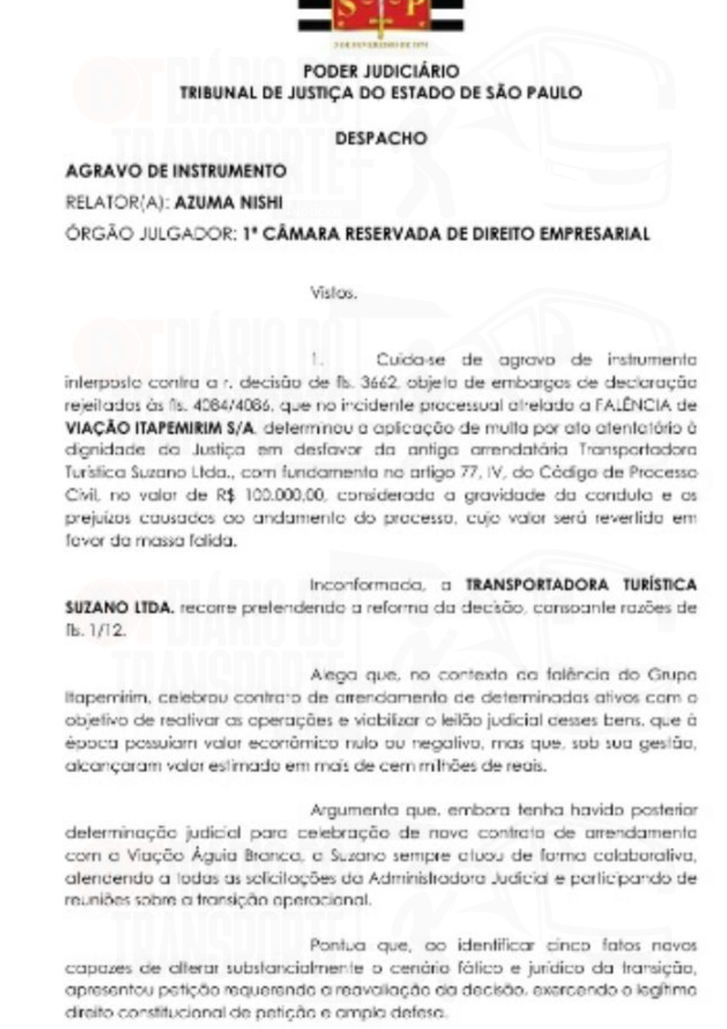 O desembargador Azuma Nishi, da 1ª Câmara Reservada de Direito Empresarial do TJSP (Tribunal de Justiça do Estado de São Paulo) intimou a administradora judicial sobre do processo de falência do Grupo Itapemirim, a se manifestar sobre mais um recurso da Transportadora Turística Suzano Ltda (Suzantur) que tenta se livrar de uma multa de R$ 100 mil por atentado à dignidade da Justiça.