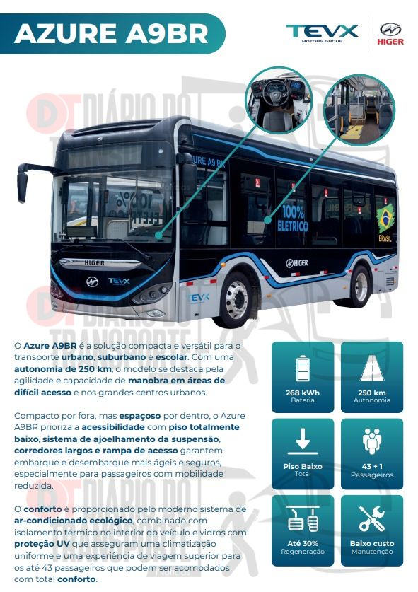 O Higer Azure A9BR é um ônibus elétrico com foco no mercado brasileiro, equipado com motor Dana, bateria de 268 kWh da CATL e piso baixo, além de suspensão pneumática e sistema de freios WABCO. O modelo tem capacidade para até 48 passageiros e oferece recursos como ajoelhamento da suspensão, painel digital ACTIA e sistema inteligente de gerenciamento de informações do veículo.