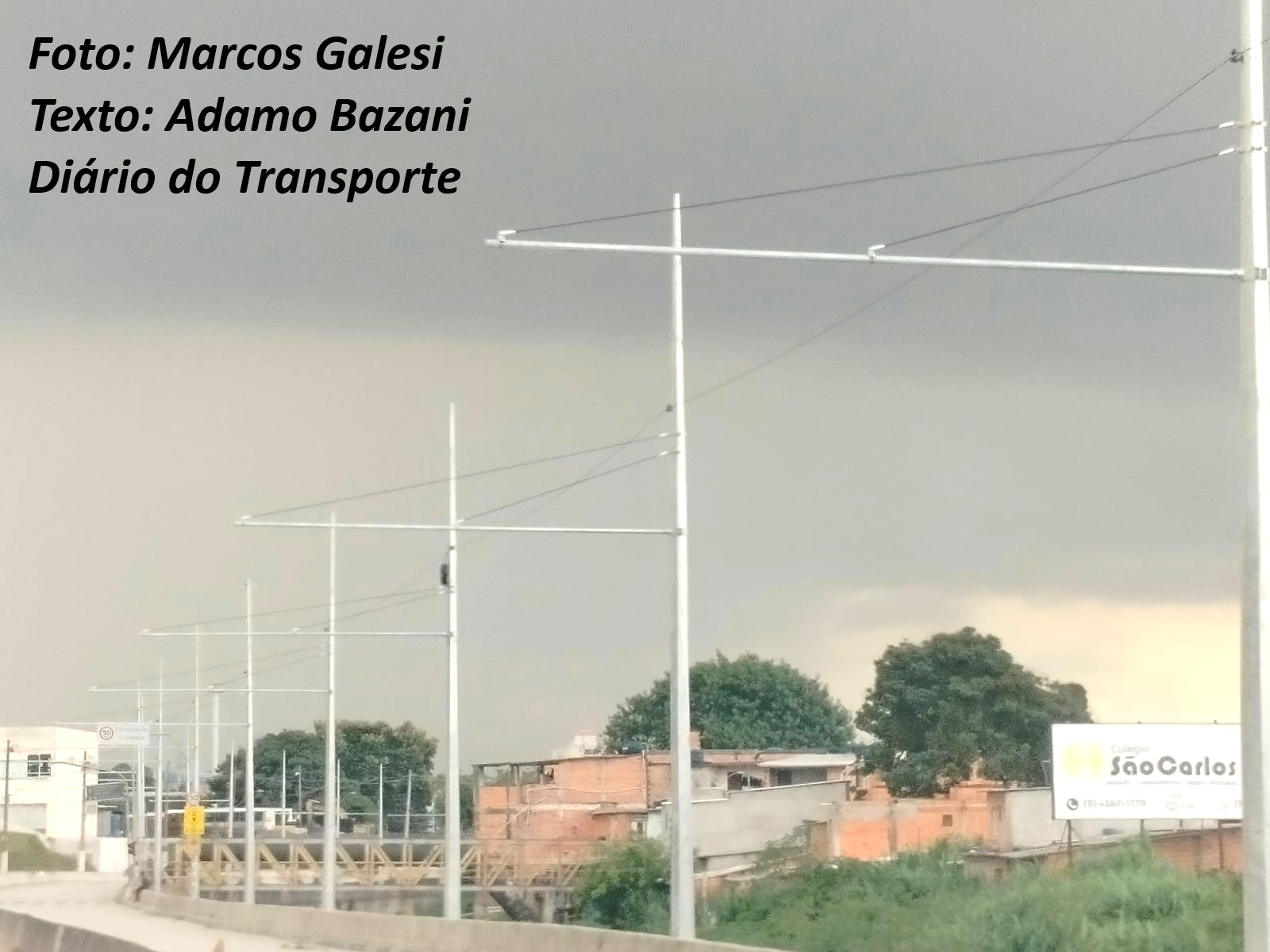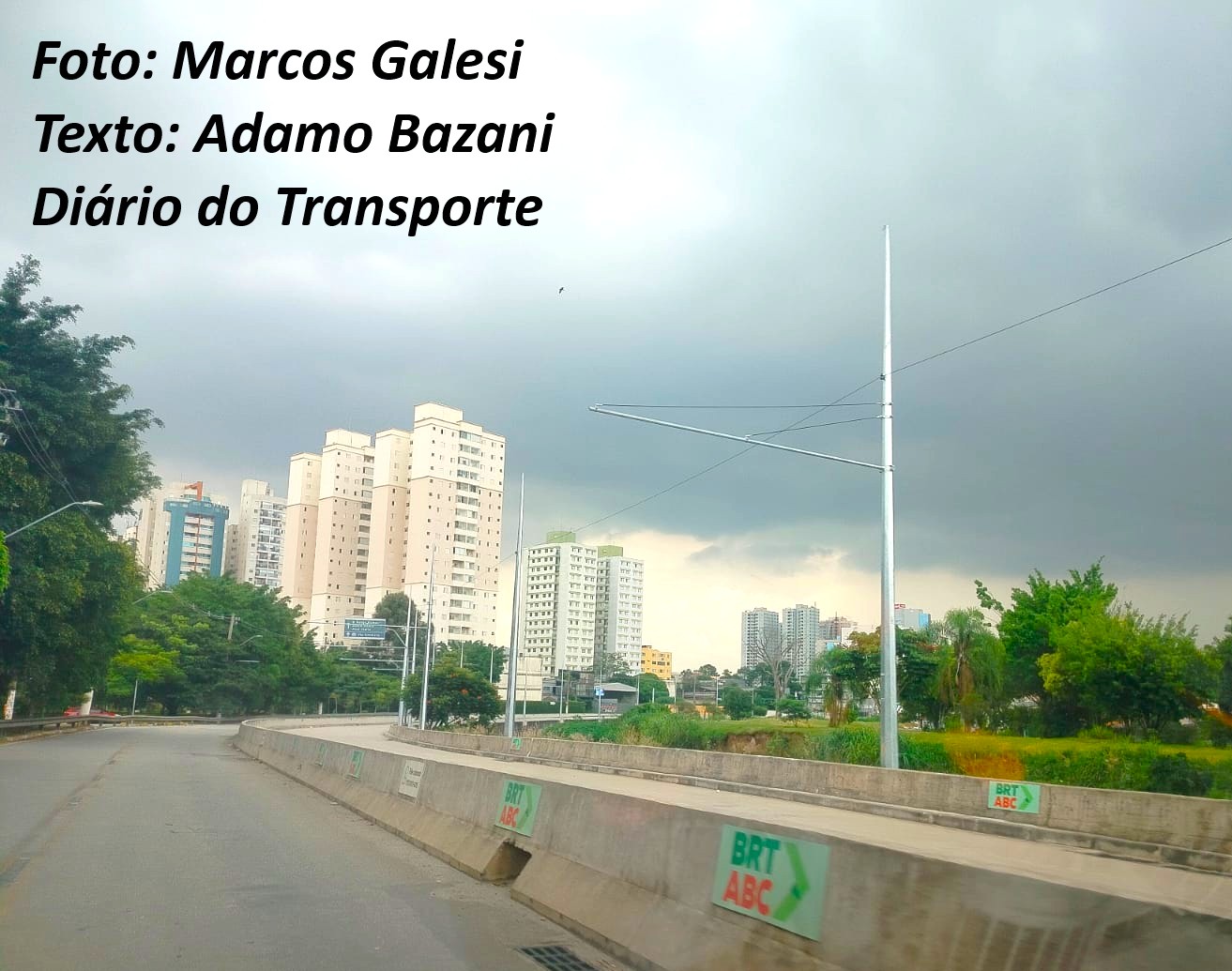 O  trecho do BRT-ABC, na Avenida Lauro Gomes, em São Bernardo do Campo (SP), a partir do bolsão de estacionamento dos ônibus municipais, começou a receber as estruturas para a fiação de recarga de oportunidade para os ônibus do tipo E-Trol.