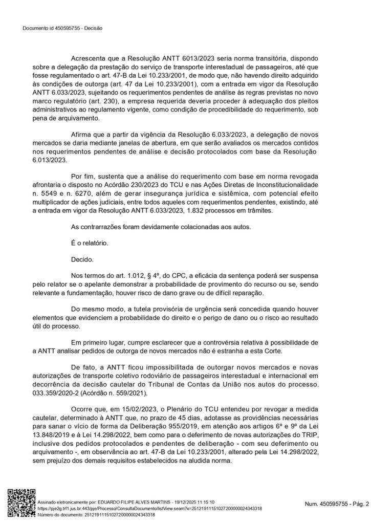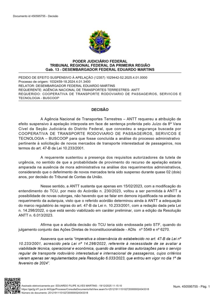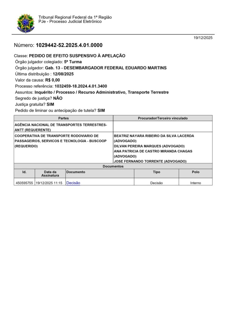 O Tribunal Regional Federal da 1ª Região concedeu nesta sexta-feira, 19 de dezembro de 2025, efeito suspensivo ao recurso de apelação da Agência Nacional de Transportes Terrestres (ANTT) e tornou sem efeito as decisões que haviam permitido à Expresso Nossa Senhora da Penha iniciar a operação de novas ligações interestaduais no Sul e Sudeste do País. Com isso, além de interromper liberações concedidas em caráter sub judice, a decisão também barrou a análise imediata de pedidos de novos mercados no transporte rodoviário interestadual de passageiros.