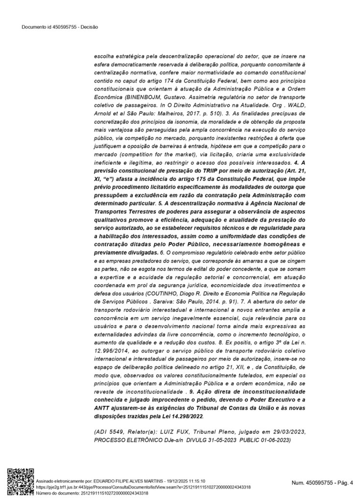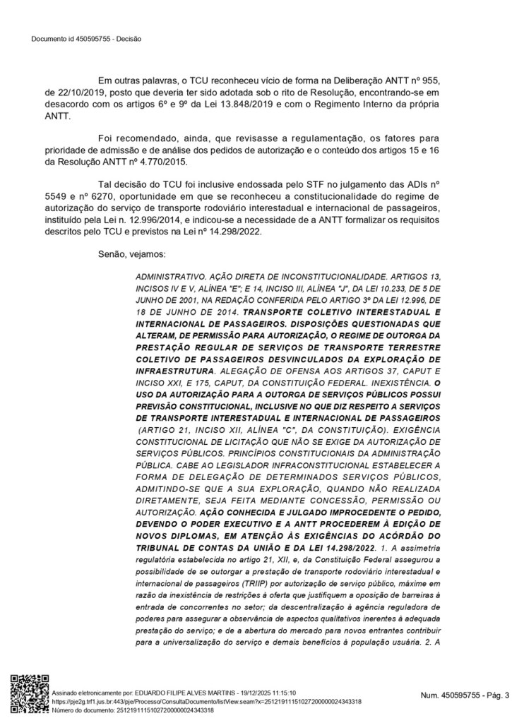 Na decisão, o relator afirma que “não há o que se falar em mora administrativa”, ressaltando que a ANTT apenas voltou a ter autorização para analisar novos mercados após a revogação da cautelar do TCU, em fevereiro de 2023, e que a edição do novo marco regulatório ocorreu dentro do prazo estabelecido.