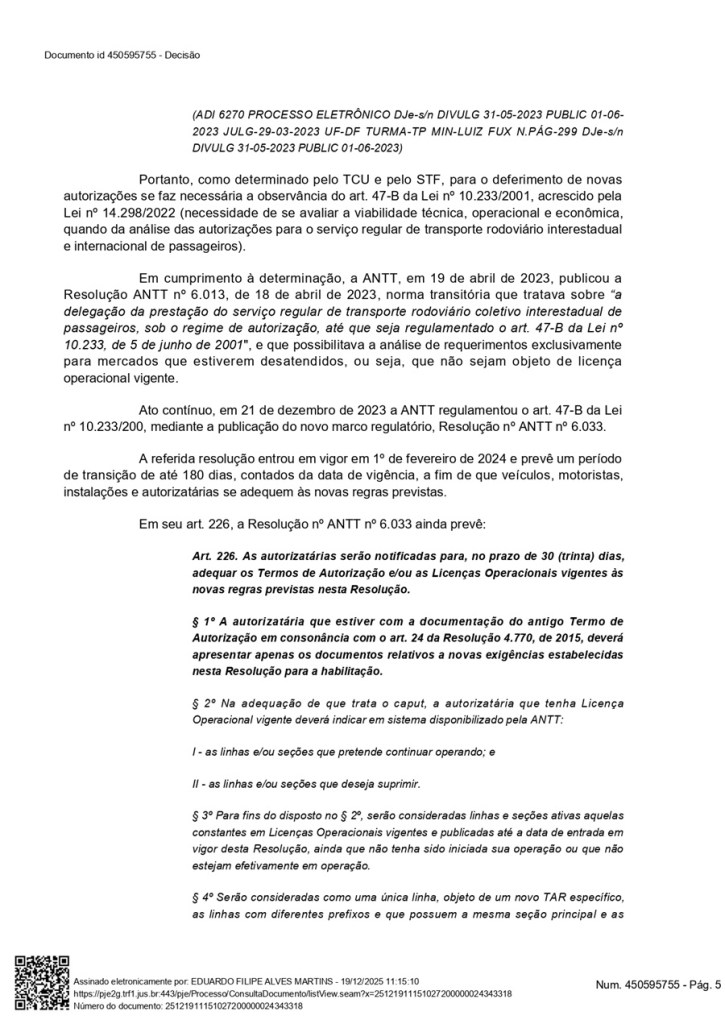 Segundo as empresas autoras das ações, os deferimentos concedidos à Penha tiveram como base a Resolução ANTT nº 6.013/2023, norma de caráter transitório que foi integralmente revogada com a entrada em vigor da Resolução nº 6.033/2023, responsável por instituir o novo marco regulatório do Transporte Rodoviário Interestadual de Passageiros (TRIP). O novo regime passou a exigir análise prévia de viabilidade técnica, operacional e econômica, além da adoção do sistema de janelas de abertura para novos mercados. Relembre: