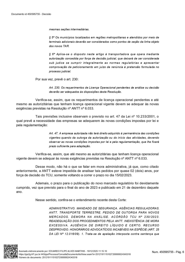 Ao analisar o pedido de efeito suspensivo da ANTT, o desembargador federal Eduardo Martins afastou a tese de mora administrativa e destacou que a agência reguladora ficou impedida de conceder novas autorizações por quase dois anos, em razão de decisões do Tribunal de Contas da União (TCU). Segundo o magistrado, não há direito adquirido à análise de pedidos com base em normas revogadas.