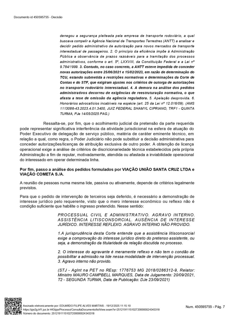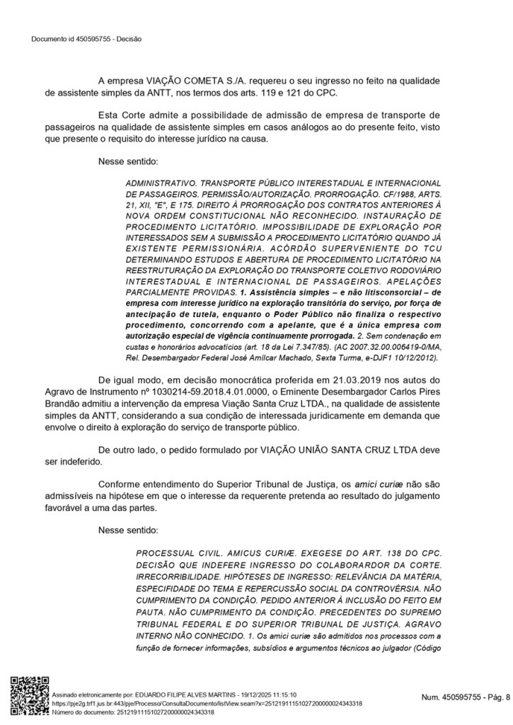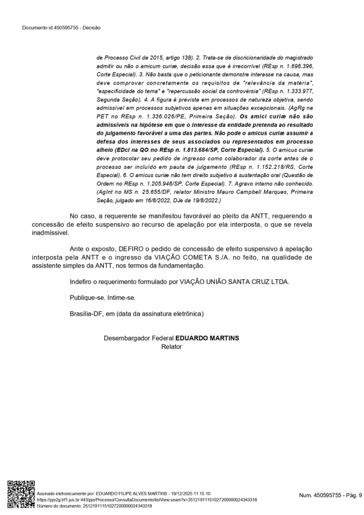 O tribunal também admitiu a Viação Cometa no processo como assistente simples, ao reconhecer interesse jurídico direto no desfecho da ação, e indeferiu o pedido da União Santa Cruz para atuar na mesma condição, por entender que, nesse ponto específico, haveria apenas interesse reflexo.